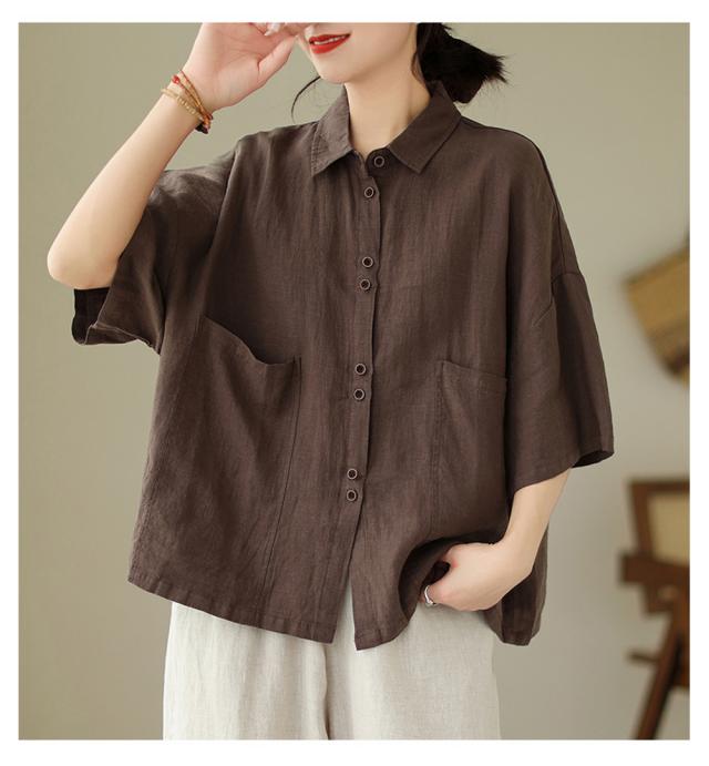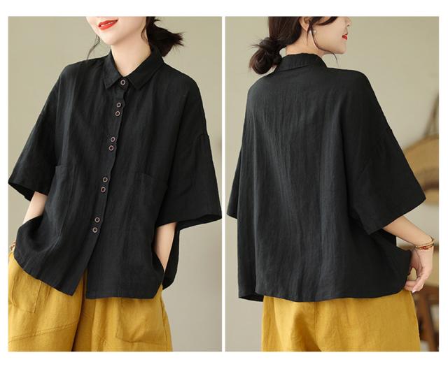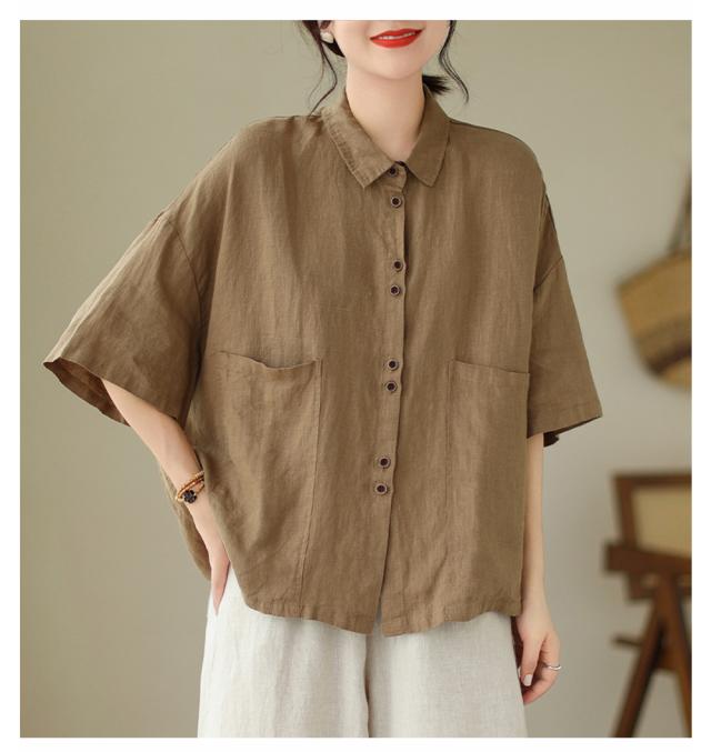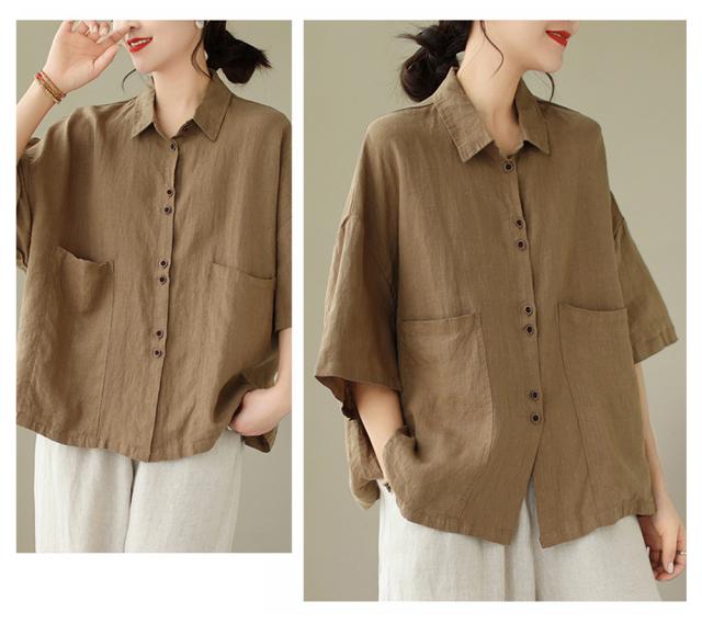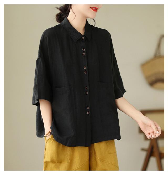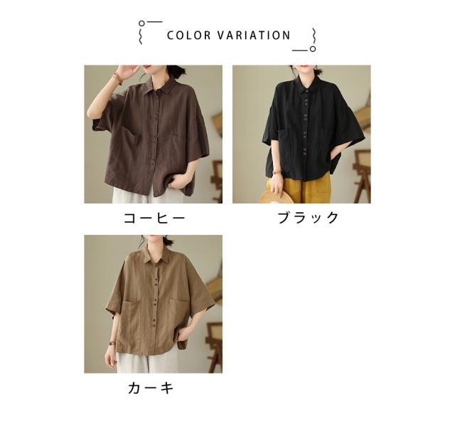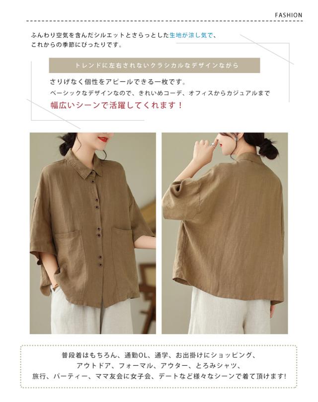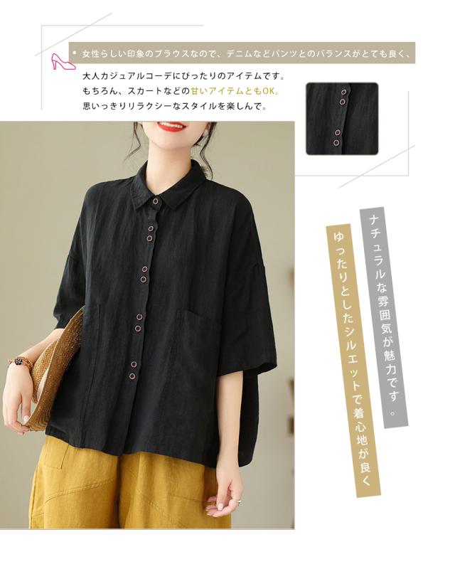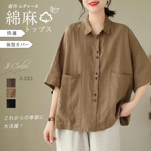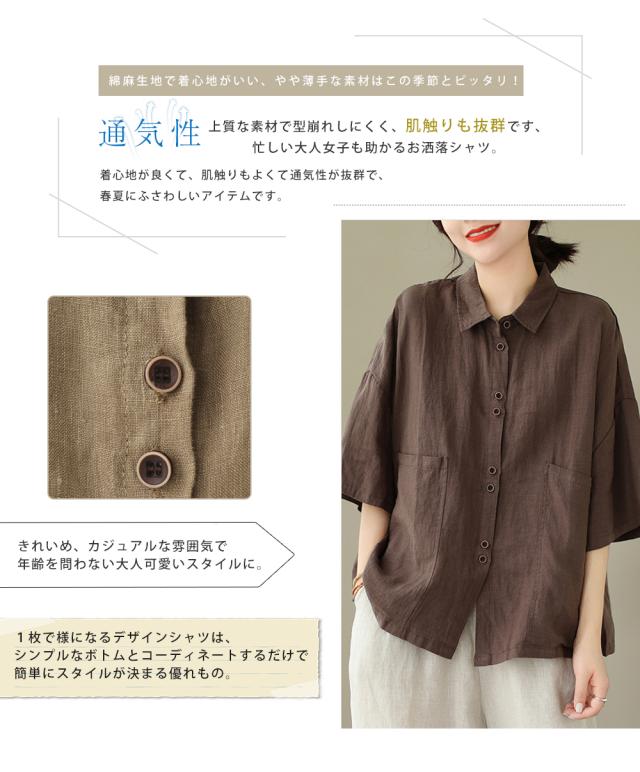シャツ ブラウス レディース 綿麻シャツ 半袖シャツ 涼しい 薄手 襟付き おしゃれ カジュアル 通勤 通気性 森ガール 夏 大きいサイズ ゆったり ナチュラル 無地
