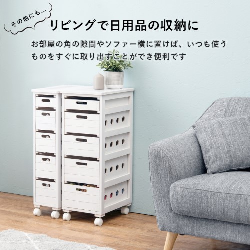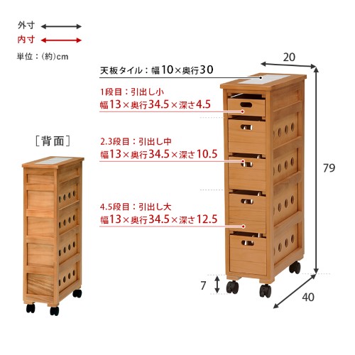 | ■天板:タイル付■本体:キャスター付(内2個ストッパー付)■引出内寸:約幅13×奥行34.5×(浅)4.5(中)10.5(深)12.5cm |