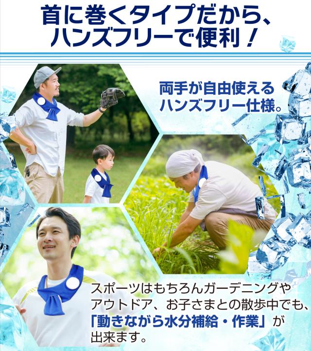 【両手が自由だから活動しやすい】首に巻くだけで両手が空くので、家事や外遊び、屋外作業などにも最適!装着も簡単でフリーサイズだから、小さい子からおじいちゃんおばあちゃんまで家族みんなでお使いいただけます。