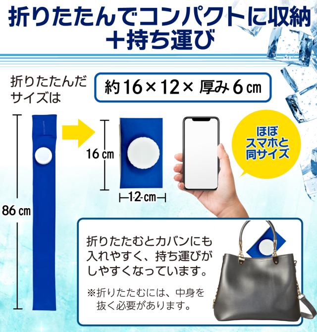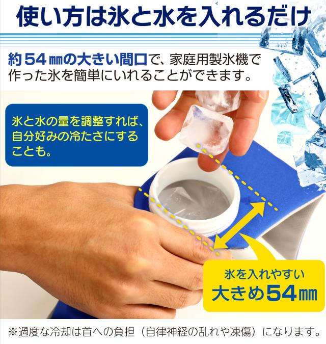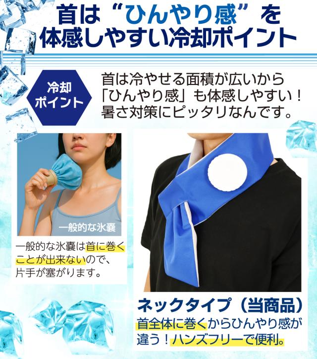 猛暑・酷暑の熱中症対策に!ぬるくなっても氷を追加するだけ。外でも冷やし直し不要で、ひんやり感がずっと続く。巻くだけ簡単な首かけタイプの氷嚢です。