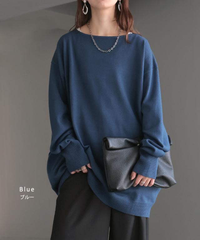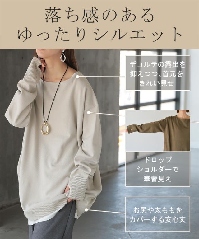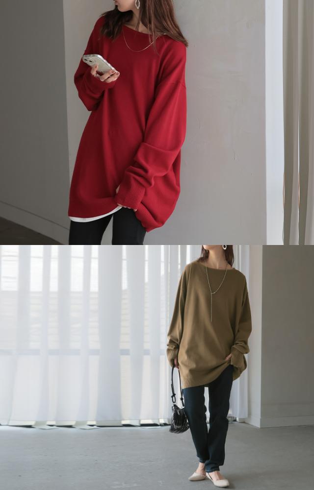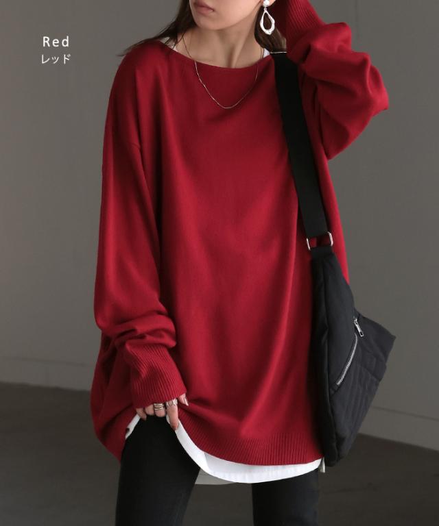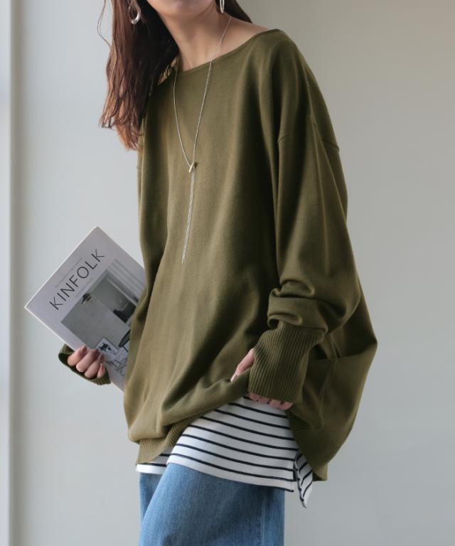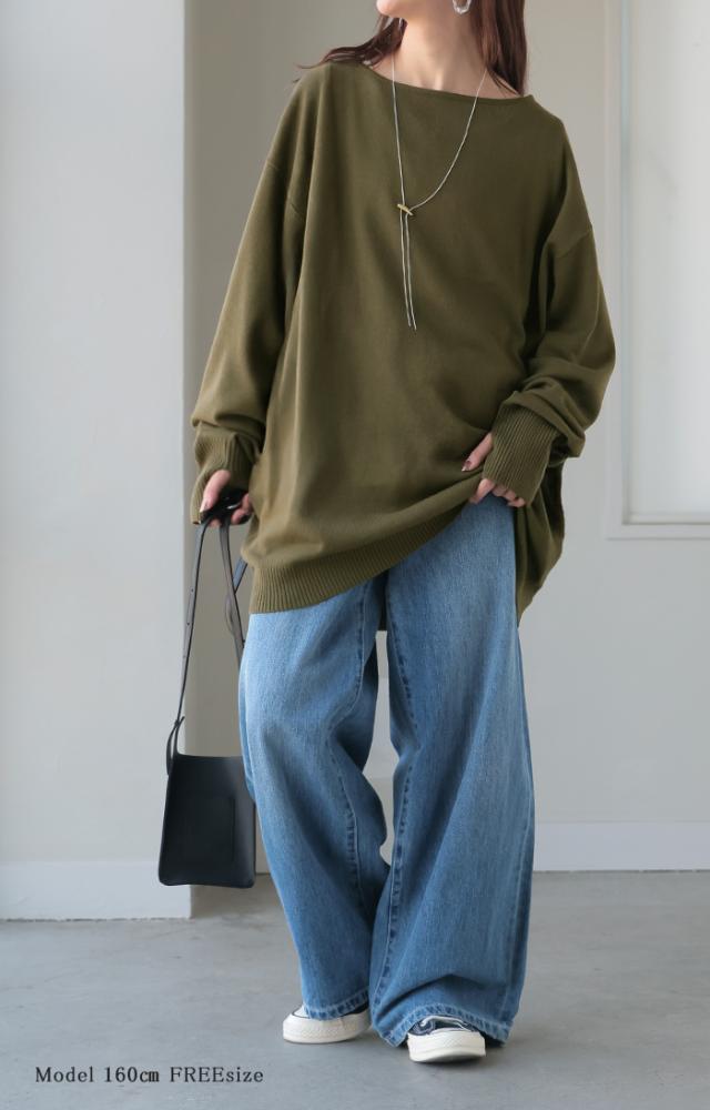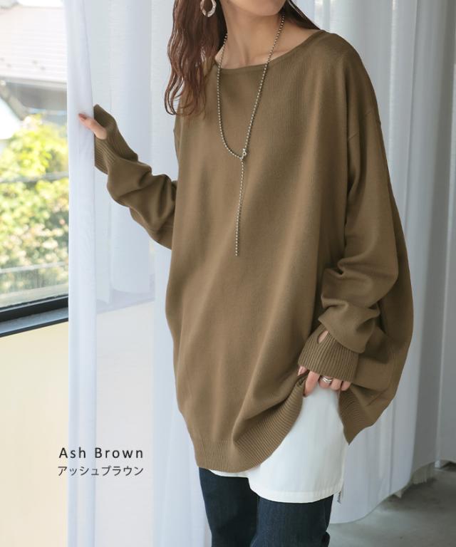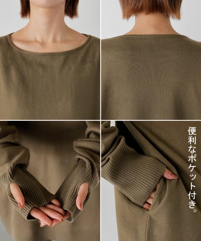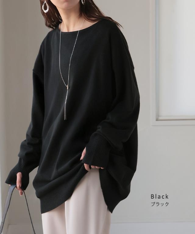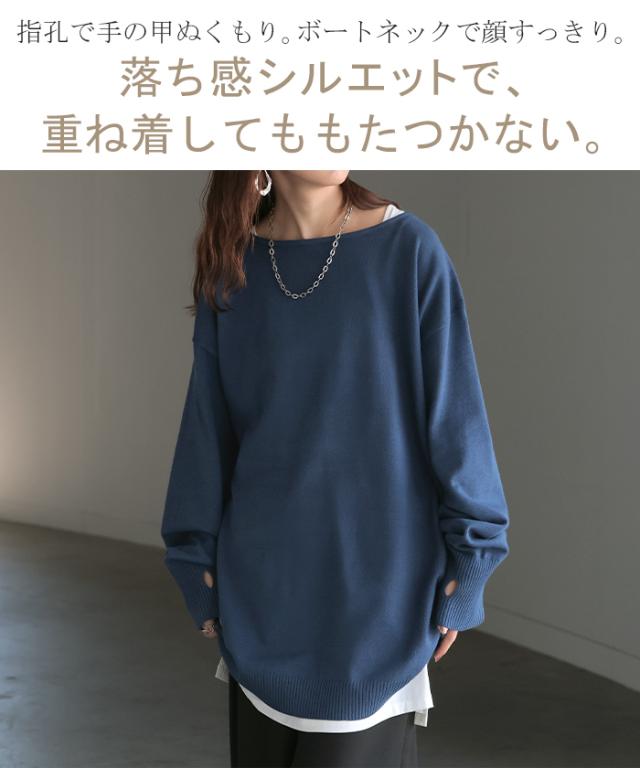 2025AW新作 ニット トップス 手袋 指穴 リブニット ライトニット レディース ボートネック セーター ロング 長袖 長い レイヤード 軽い チュニック ドルマン ゆったり 大きいサイズ 体型カバー お尻が隠れる 黒 白 秋 冬 HUG.U 秋新作