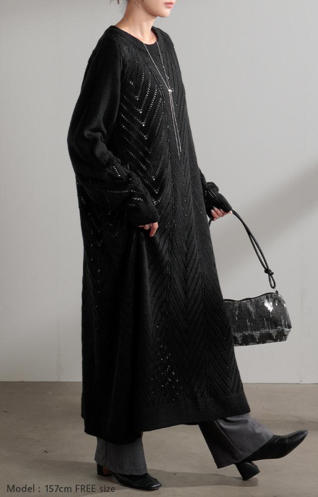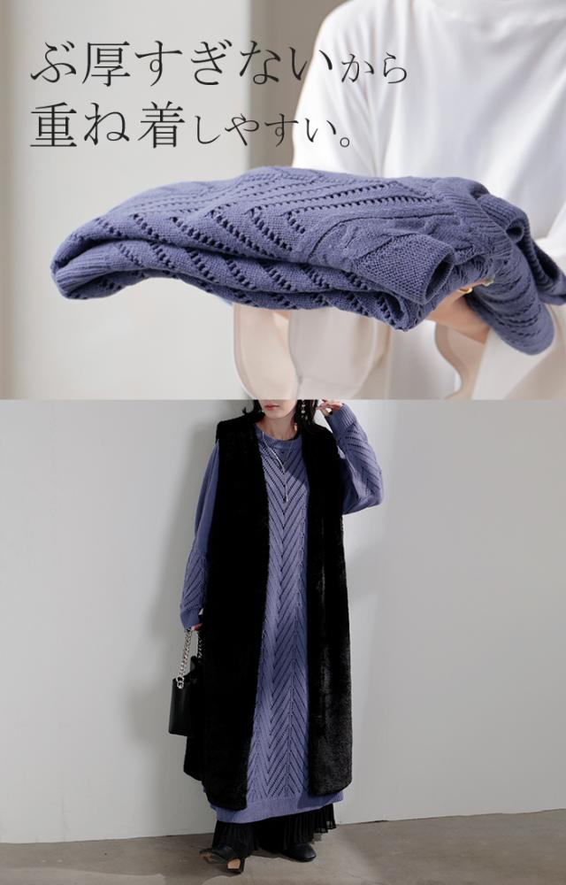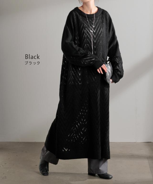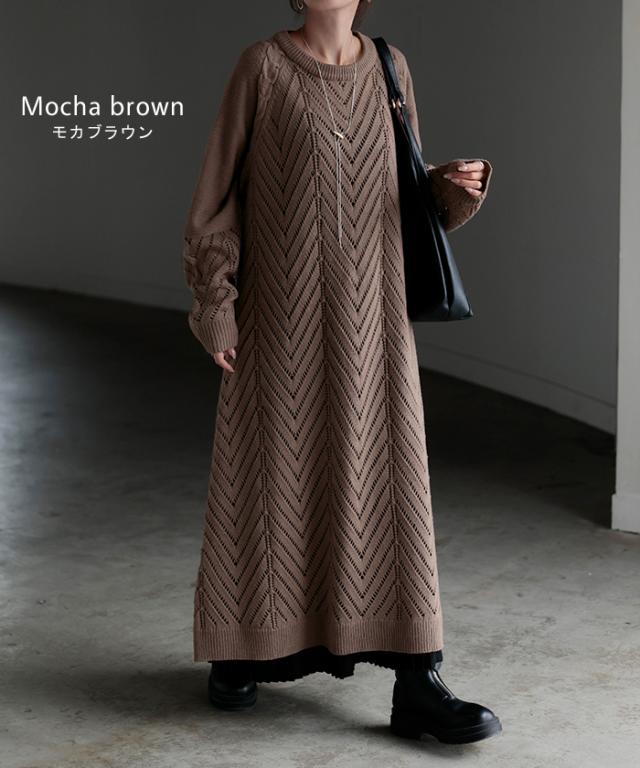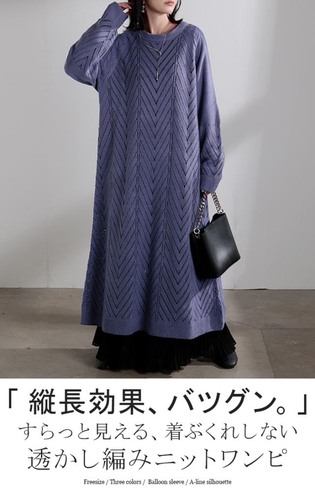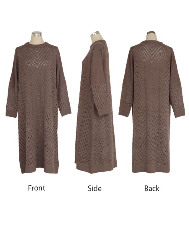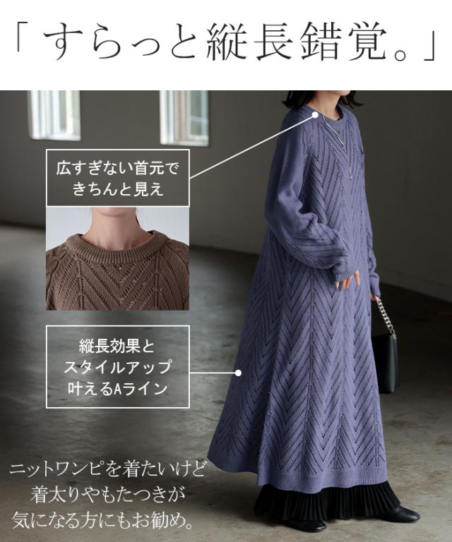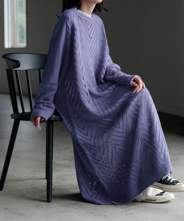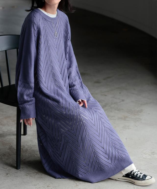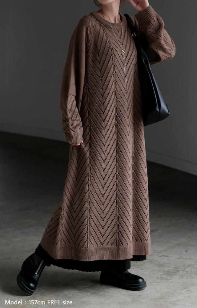 透かし柄のデザイン編地が可愛いニットワンピースです。
