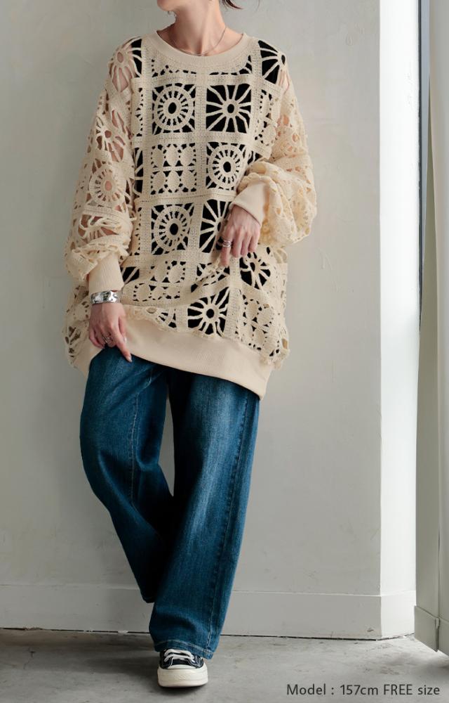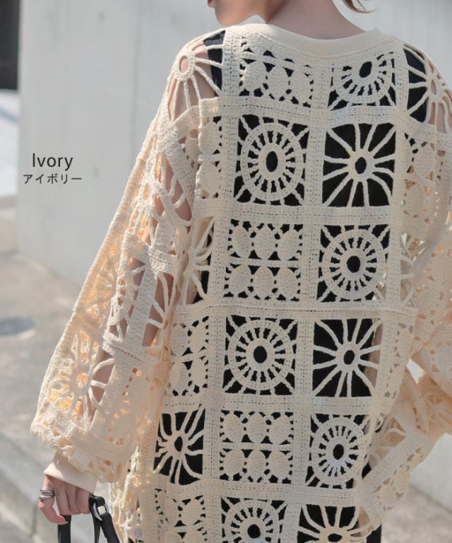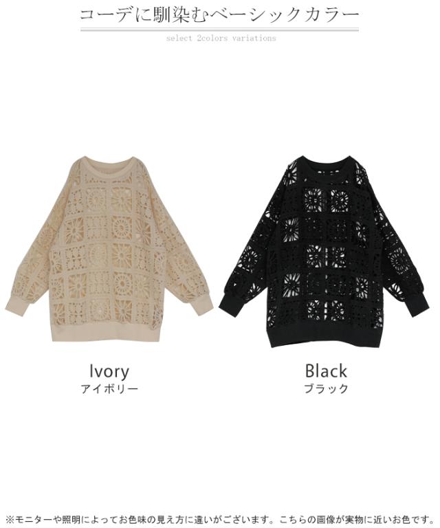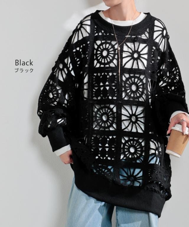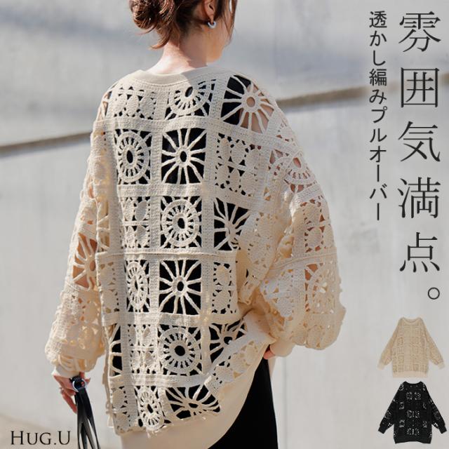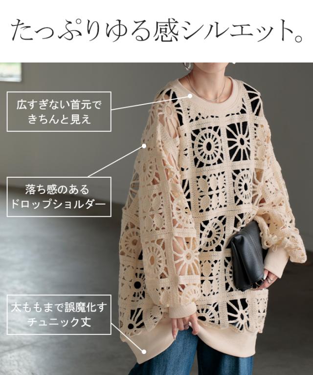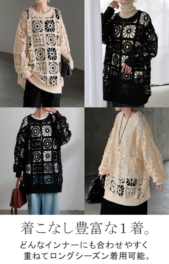 2025AW新作 ニット 透かし編み レディース トップス オーバー メッシュ クロシェ編み かぎ編み ロング 長袖 長い レイヤード 厚手 シアー チュニック ゆったり 大きいサイズ 花柄 体型カバー お尻が隠れる ナチュラル 黒 アイボリー 春 夏 HUG.U 秋新作