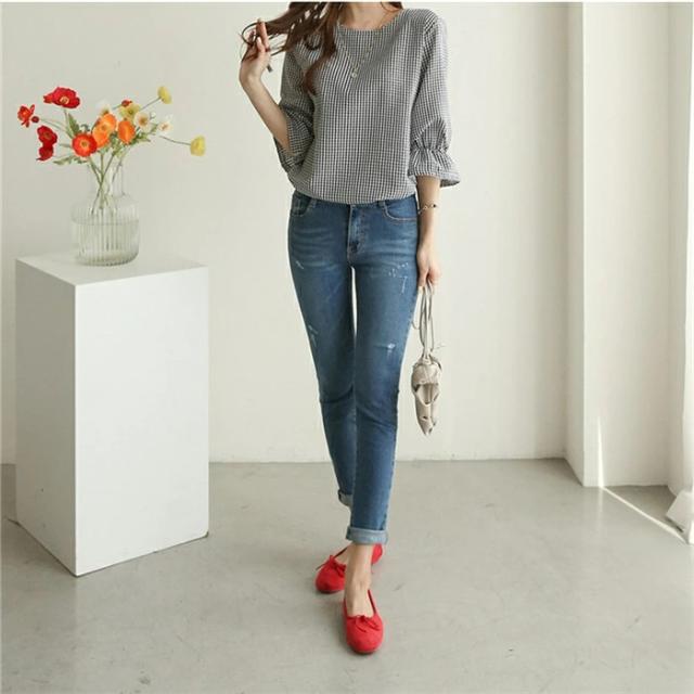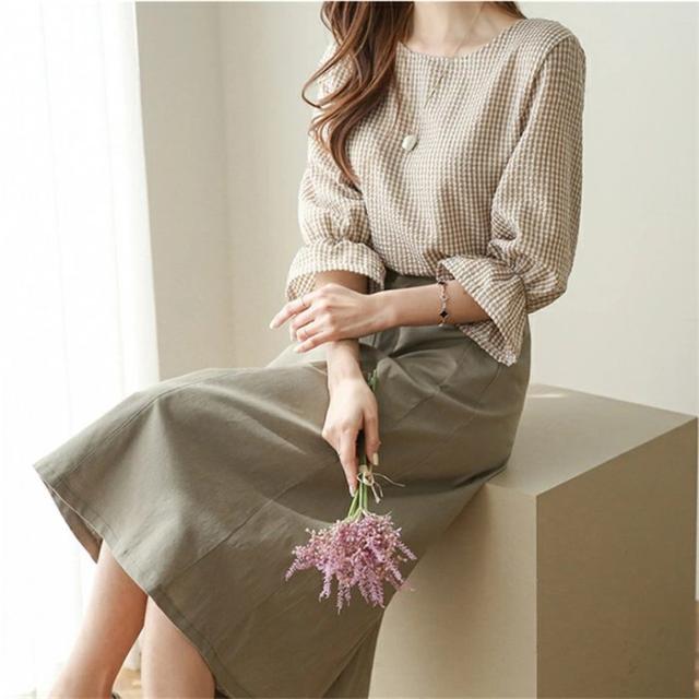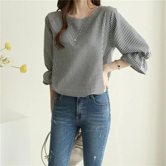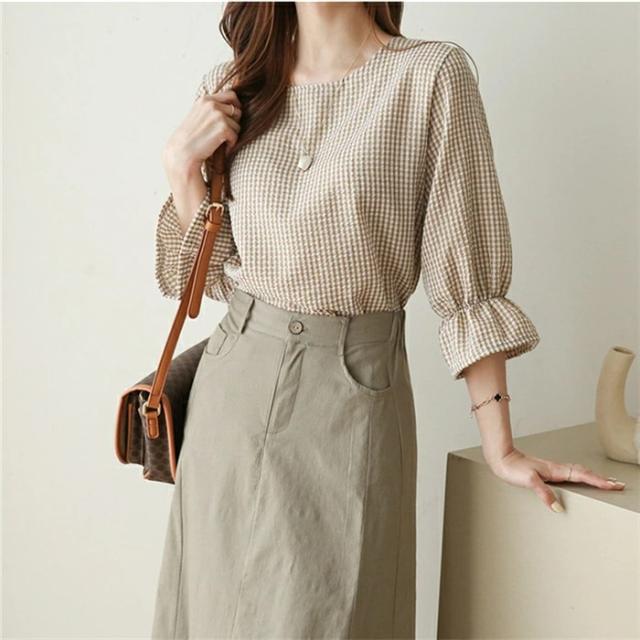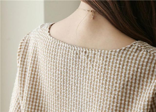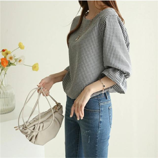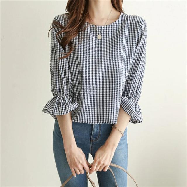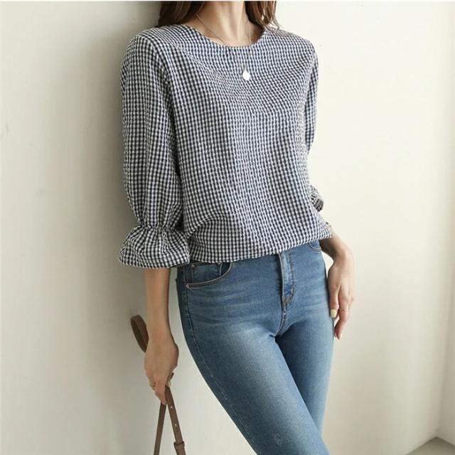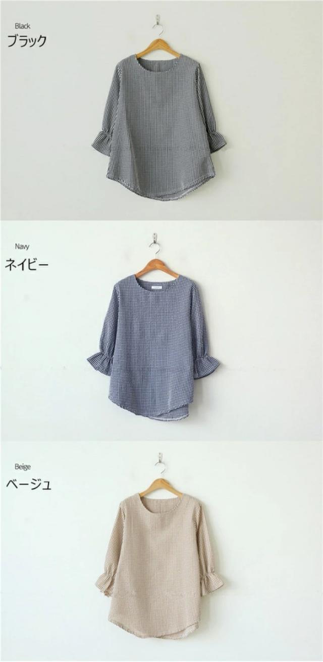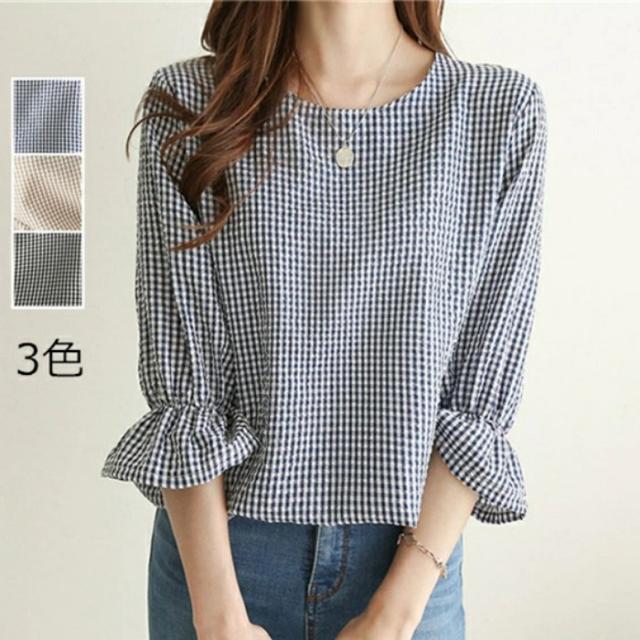 シャツ ブラウス レディース トップス チェック柄 七分袖 森ガール 三色 プルオーバー 春夏 フリル tシャツ