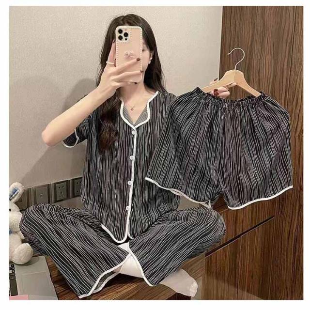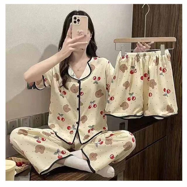 | 【半袖トップス+ロングパンツ+ショートパンツのパジャマ3点セット】 大人可愛いデザインのパジャマ3点セットです。 前開き前ボタンタイプで着やすいので、授乳や入院などにもおすすめ。 ウエストはゴム仕様なので、たくさん動いてもストレスなく快適に着用いただけます。 おうち時間も可愛く♪夏を涼しく快適に過ごせる着心地抜群なルームウェア。 | |
