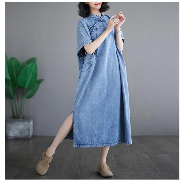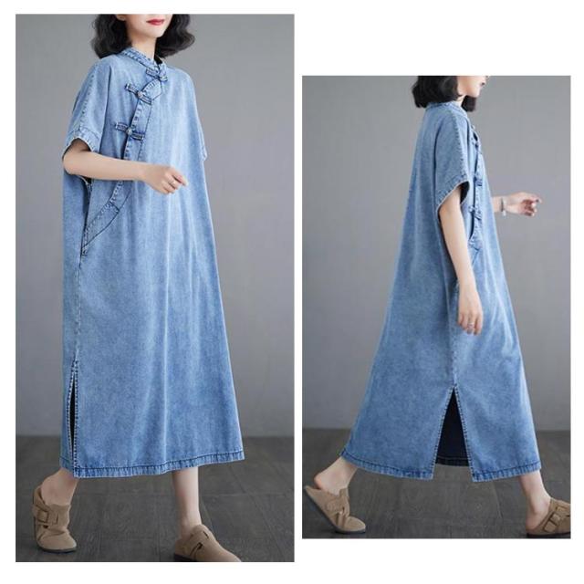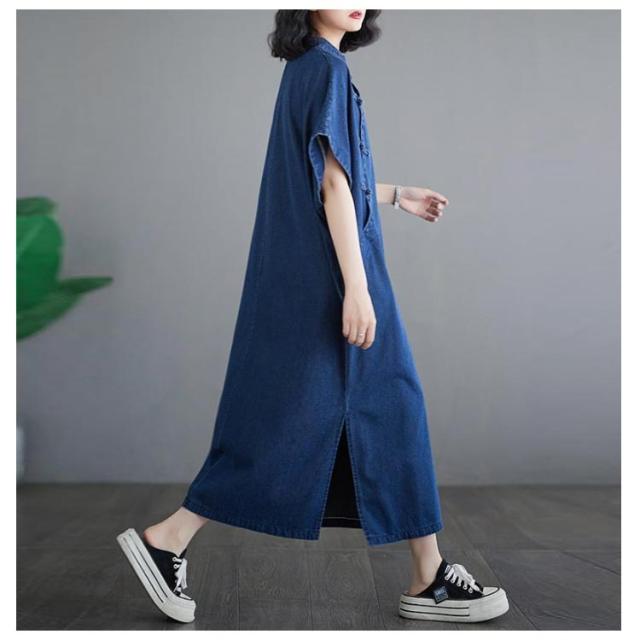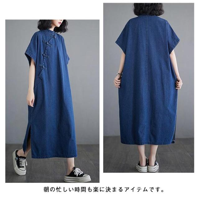 デニムワンピース カジュアル レディース 半袖 体型カバー レトロ デニム チャイナボタン ポケット付き ロングワンピース ワンピース 着痩せ デニムワンピース スリット入り M L XL