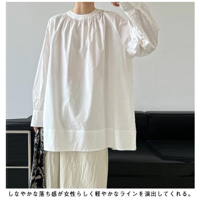 スリット入り チュニックブラウス ブラウス スタンドカラー ロングシャツ ロング丈 チュニック レディース ブラウス シャツ ギャザー入り ブラウス 大人 かわいい 体型カバー カジュアル M L