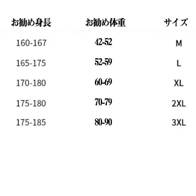 | サイズについての説明 | M お勧め体重42.5-52.5kg L お勧め体重52.5-60kg XLお勧め体重60-70kg 2XLお勧め体重70-80kg 3XLお勧め体重80-90kg |
