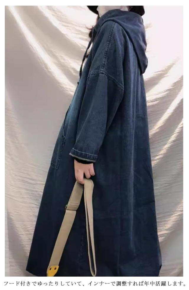 | ストレートなフード付きロング丈デニムワンピース。 軽いながら柔らかいデニム生地を使用していますので、そのまま一着でも着用頂けます。 フード付きでゆったりしていて、インナーで調整すれば年中活躍します。 体型カバーも自在にできるワンピースはとても重宝しますし、ルーズすぎず合わせやすいなワンピースは着回しの強い味方です。 ポケットが入っているため、小物など収納できます。 シンプルで落ち着いた大人の着こなしができるデザインです。 | |
