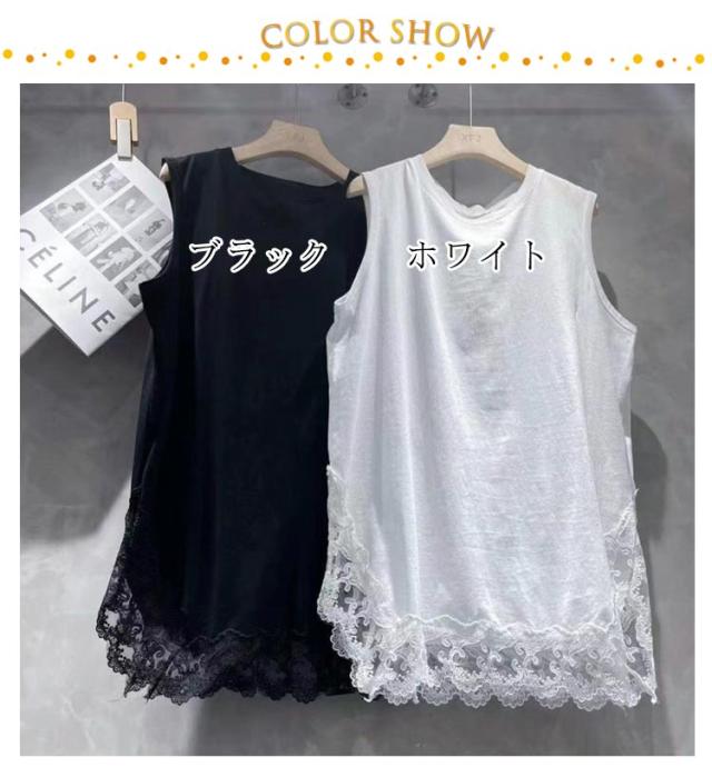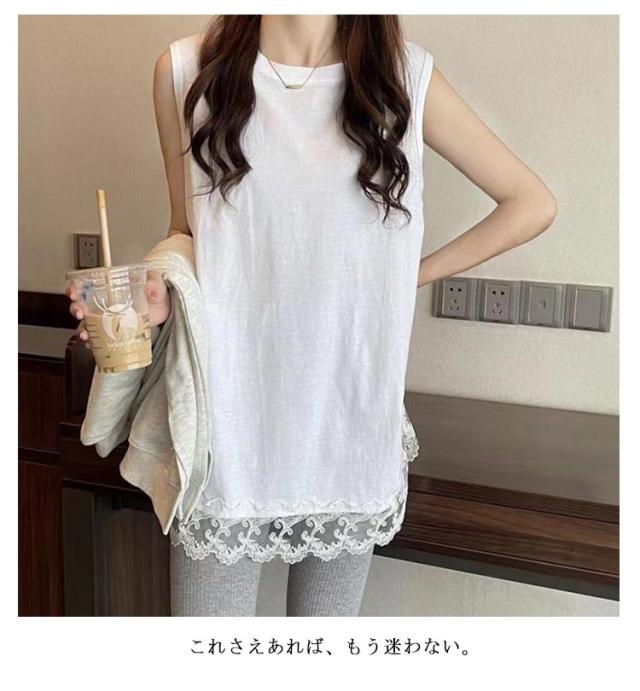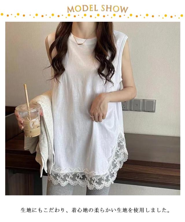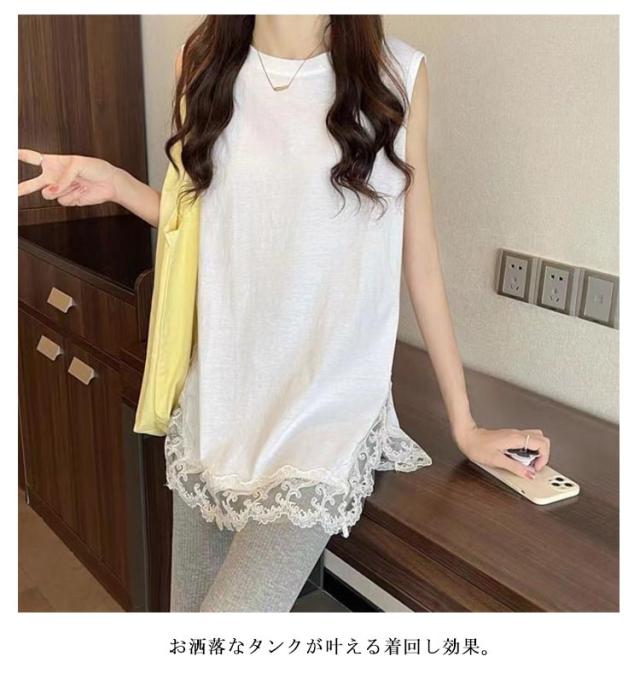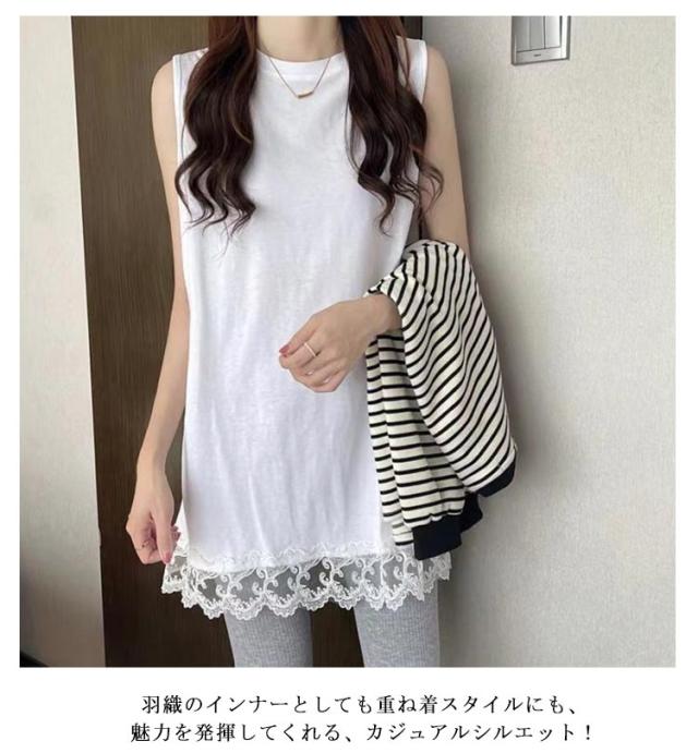 トップス タンクトップ クルーネック 無地 タンクトップ カットソー 夏 レディース ノースリーブ 薄手 レイヤード きれいめ ロングタンクトップ シンプル レース裾 春夏 tシャツ インナー 春 秋 大きいサイズ 重ね着 体型カバー レース切り替え