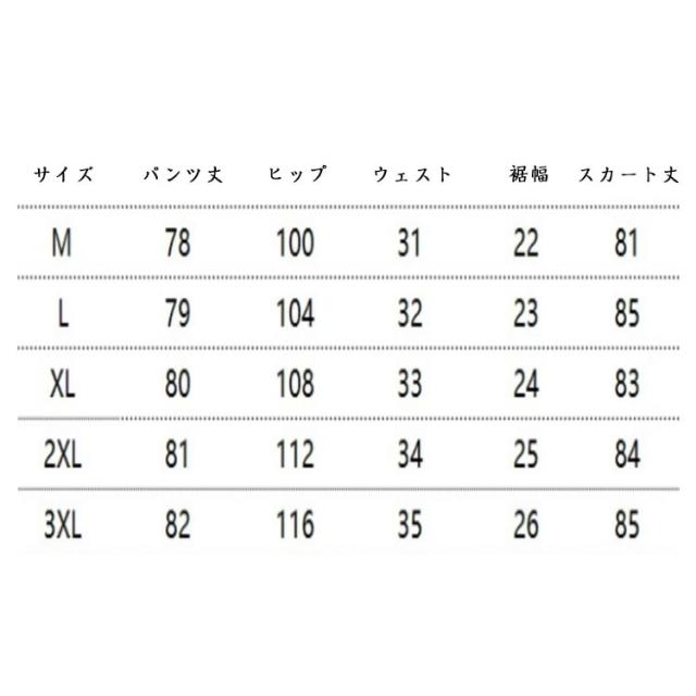 | サイズについての説明 | サイズ パンツ丈 ヒップ ウエスト 裾幅 スカート丈 ※サイズ表の実寸法は商品によって1-3cm程度の誤差がある場合がございます。 |