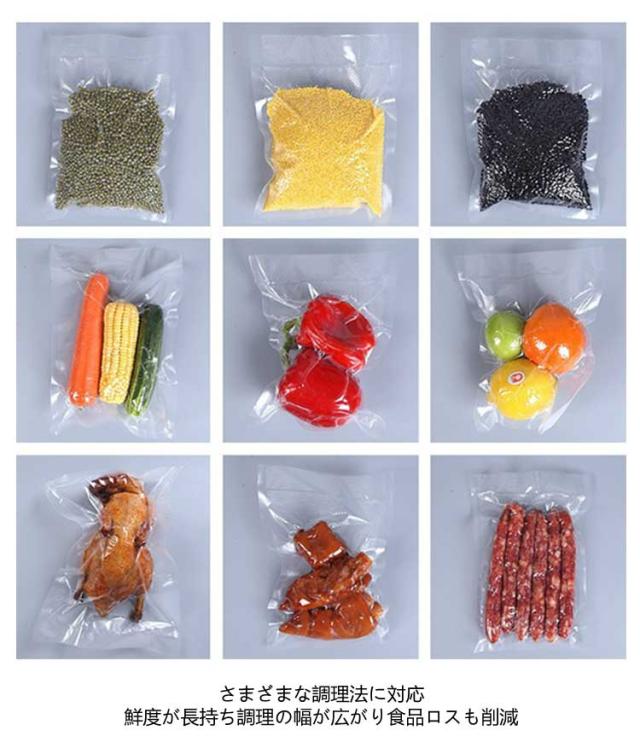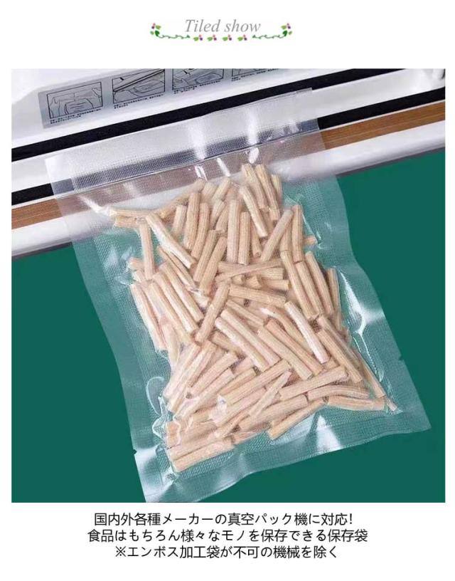 | 真空パック袋 100枚入り 片面エンボス加工 12×20cm 17×25cm 20×25cm 20×30cm 15×20cm 国内外各種メーカーの真空パック機に対応!食品はもちろん様々なモノを保存できる保存袋 ※エンボス加工袋が不可の機械を除く さまざまな調理法に対応 鮮度が長持ち調理の幅が広がり食品ロスも削減 片面エンボス加工 袋内の空気を効率よく脱気できる 内容物も付きにくい V型ノッチ(切り込み口)付き ハサミ要らずの簡単開封 キャンプ・食事会など外出先調理に重宝 伸縮性・高強度熱にも強い 一般的なコピー用紙の約2倍の厚さ(0.19mm) 伸び率も高く破れにくい防臭・防漏の効果も 油性ペンに対応 簡単に書き込め、 にじみづらく消えにくい内容物管理に便利 高品質素材PE&PET 無毒・無臭・耐候性等からだに優しい安心素材 良質が頷ける透明度 リサイクルが可能 しっかりと洗浄すれば繰り返し使える 環境にやさしく経済的 【ご使用用途】 お肉やお魚、野菜、お米などの一般食材はもちろん、お料理の下ごしらえ、作りおきのお惣菜やコーヒー豆からペットフード、 非常食、装飾品の保管まで、黒ずみとなる酸化を抑えしっかりと保存いたします。 また、保存だけでなく「防臭・防漏 」効果で持ち運びにも便利で開封用切込み口付きなので中身もさっと取り出せます。 バーベキュー、お料理教室、ホームパーティー、飲食店、差し入れ等、様々な用途でご使用いただけます。 湯煎、冷蔵、冷凍、低温調理、電子レンジなど幅広くお使いいただけますので、一人暮らしからファミリー用、業務用までジャンルを問わずご活用いただけます。 ※注意事項※発酵食品(パンやチーズ、生ラーメンの生地など)や、ガスが出やすい食料品(煎ったばかりのコーヒー豆、生の野菜、バナナなど)は、そのまま真空パックにすると、袋の中でガスがたまって袋がふくらむことがあります。これは袋に穴が開いているわけではなく、食べものから出たガスなどが原因となります。 こういった食品は、初めに個別で冷凍し、真空パックをしてから、さらに冷凍保存をしていただくことで、袋が膨らむのを防ぎしっかりと保存することができます。 | |