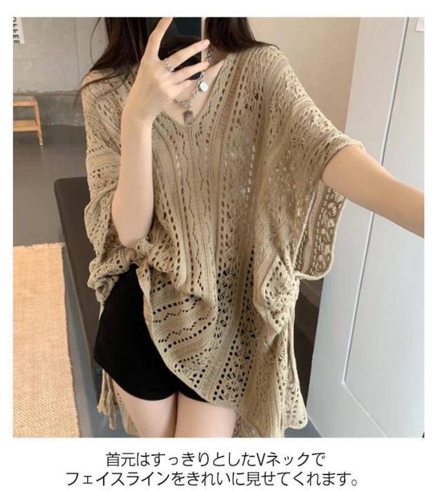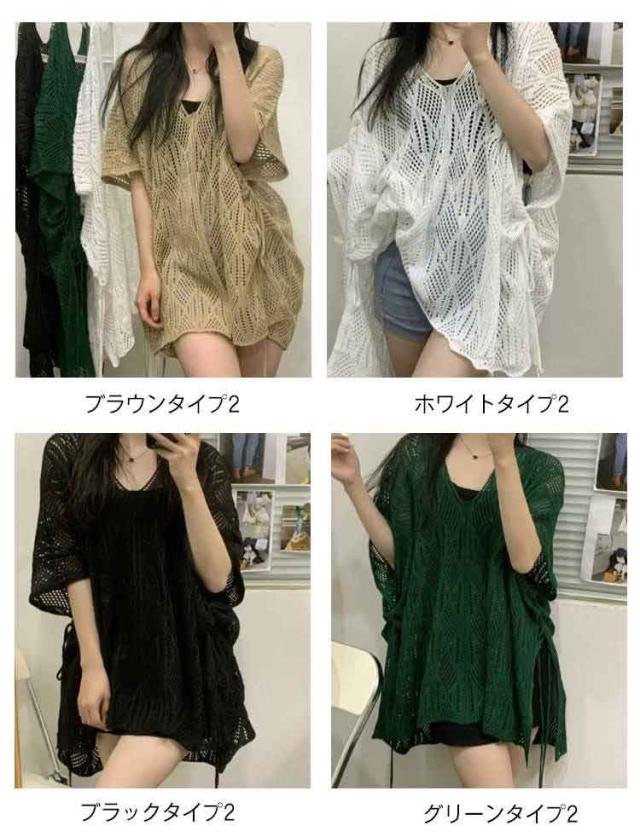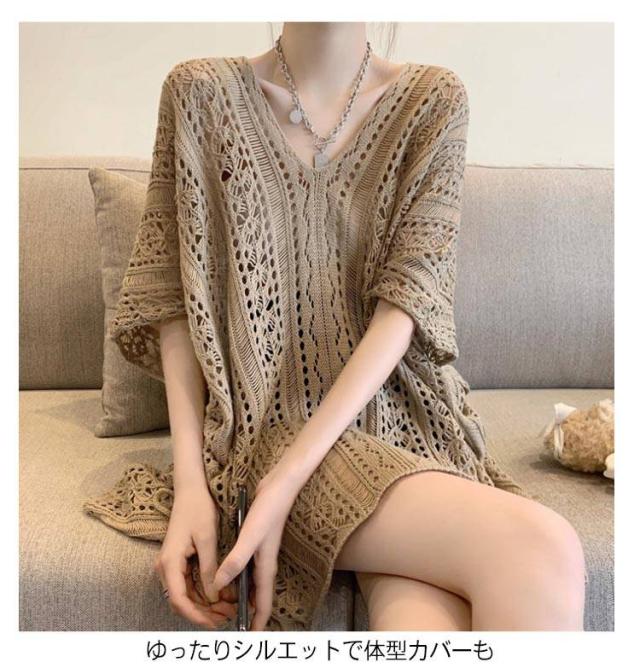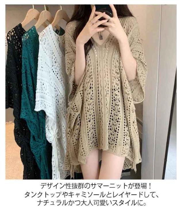 レディース 透かし編みニット 薄手 サマーニット Vネック サマートップス プルオーバー シースルー トップス ゆったり 夏用 半袖 カジュアル