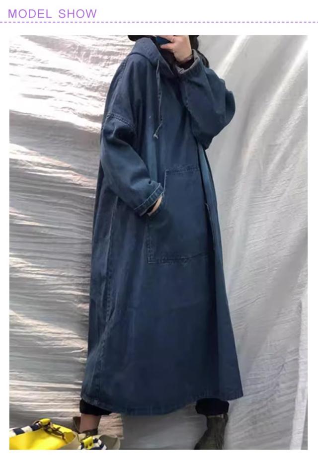 | ストレートなフード付きロング丈デニムワンピース。 軽いながら柔らかいデニム生地を使用していますので、そのまま一着でも着用頂けます。 フード付きでゆったりしていて、インナーで調整すれば年中活躍します。 体型カバーも自在にできるワンピースはとても重宝しますし、ルーズすぎず合わせやすいなワンピースは着回しの強い味方です。 ポケットが入っているため、小物など収納できます。 シンプルで落ち着いた大人の着こなしができるデザインです。 | |