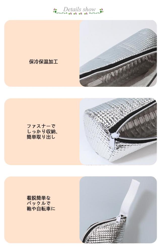 | 保冷・保温ボトルカバー 650mlまで適用 着脱簡単 衝撃吸収 ペットボトルを全て覆うポーチ型保冷・保温カバーです。 【商品説明】 ◇強力な保冷力:3mm厚の断熱層+両面アルミ構造で、長時間冷たさをキープ ◇結露防止構造:内側は吸水性のあるマイクロファイバータオル素材で結露対策も安心 ◇コンパクト収納:折り畳んで小さく収納可能。携帯に便利 独自の保冷効果 「独自の【両面アルミ・厚さ3mm】断熱素材」 ・外側で熱を反射し、内側で冷気を循環させることで ・一般的な片面の保冷効果よりもダブル効果を発揮します。 結露?策 「裏地全体がマイクロファイバータオル仕様」で 結露対策ができてカバンが濡れにくい。 <お勧めポイント> ・保冷保温加工 ・ファスナーでしっかり収納、簡単取り出し ・衝撃吸収で水筒などを保護 ・着脱簡単なバックルで鞄や自転車に | |