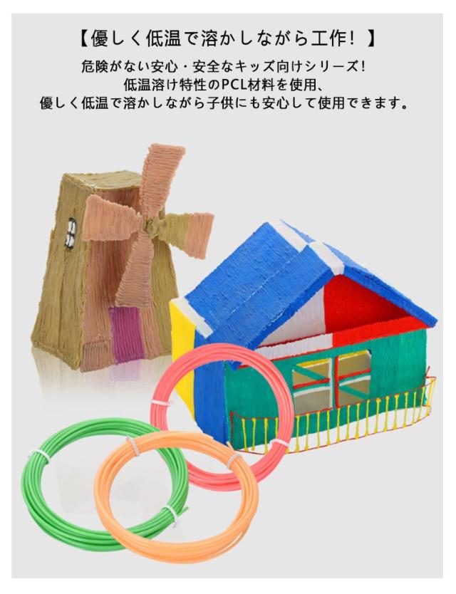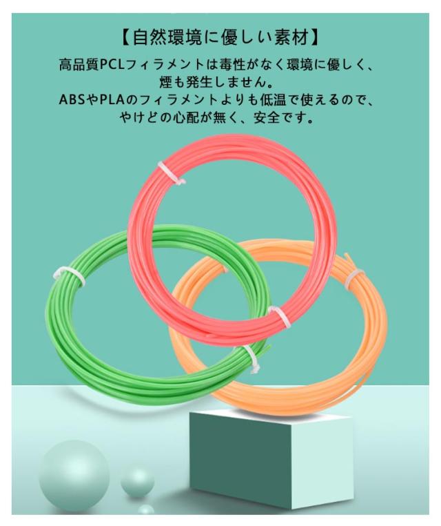 | 3Dペン専用フィラメント 低温PCL/高温PLA 5M×10色セット 【豊かな10色・各色5m】 想像力を高め子供も大人も楽しめる低温3Dペン用のPCLフィラメントです。10色の人気カラーがあり、作りたい作品の図案をガラスやシリコンの下にひいてなぞるだけでオリジナルアクセサリーやフィギュアパーツも作成可能です。 【自然環境に優しい素材】 高品質PCLフィラメントは毒性がなく環境に優しく、煙も発生しません。ABSやPLAのフィラメントよりも低温で使えるので、やけどの心配が無く、安全です。 【優しく低温で溶かしながら工作!】 危険がない安心・安全なキッズ向けシリーズ!低温溶け特性のPCL材料を使用、優しく低温で溶かしながら子供にも安心して使用できます。 【ユニバーサル互換性】 こちらの低温3Dペン用のPCLフィラメントはほとんどの1.75 mm3Dペンおよび3Dプリンターと互換性があります。3Doodlerペンには適していません。 | |