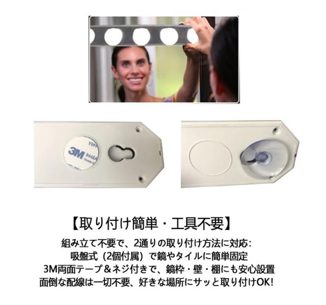 | 【調光・色温調整可能】女優ミラー用LEDライト 【10段階の明るさ調整】 ボタンひとつで10段階の明るさに調節可能。暗い部屋でも、顔全体がしっかり照らされ、メイクの仕上がりをぐっと美しく仕上げられます。細かな部分も見逃さず、毎日のメイクアップがもっと楽しくなります。 【3色のライトモード】 3つの照明カラー(昼白色・電球色・ウォームホワイト)を自由に切り替え可能。 シーンや気分、メイクスタイルに合わせて、最適な光を選べます。**自然光に近い色温で、肌色を正確に映し出します。 【取り付け簡単・工具不要】 組み立て不要で、2通りの取り付け方法に対応: 吸盤式(2個付属)で鏡やタイルに簡単固定 3M両面テープ&ネジ付きで、鏡枠・壁・棚にも安心設置 面倒な配線は一切不要、好きな場所にサッと取り付けOK! 【USB給電式・どこでも使える】 付属の2.3m USBケーブルで給電もラクラク。 でも使用可能で、コンセントがない場所でもOK! 軽量&コンパクトだから、旅行先・出張先でも活躍します。 【様々なシーンで大活躍】 ● メイクアップ ● 洗面所や浴室の照明 ● ドレッサーの装飾 ● 写真・動画撮影時のライティング コンパクトでも明るさは十分!プロ仕様の女優ミラーライトで、毎日をもっと美しく、快適に。 | |