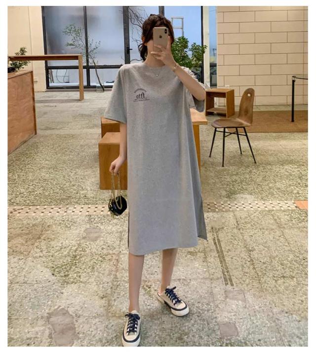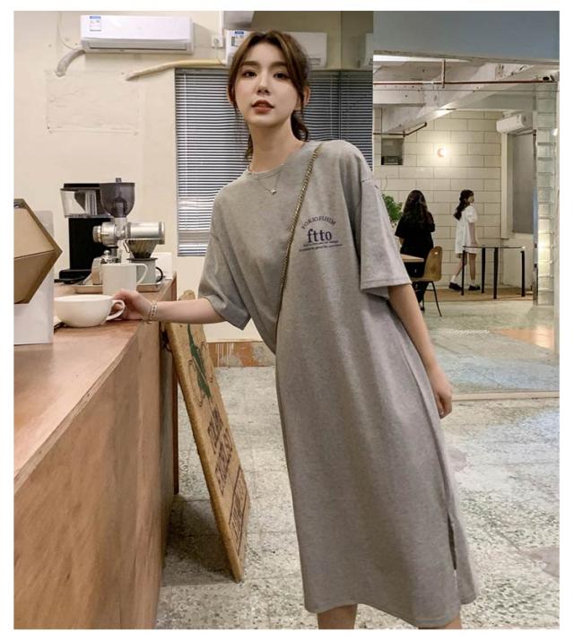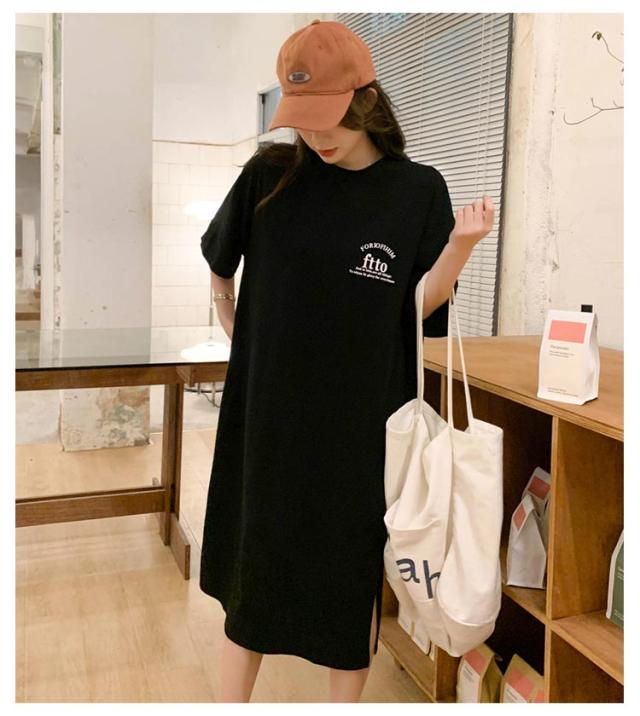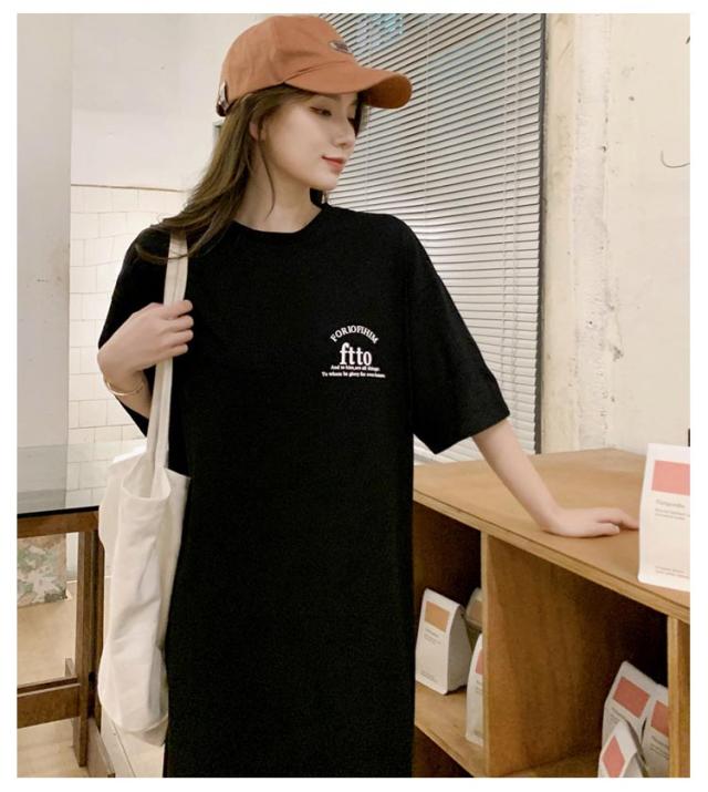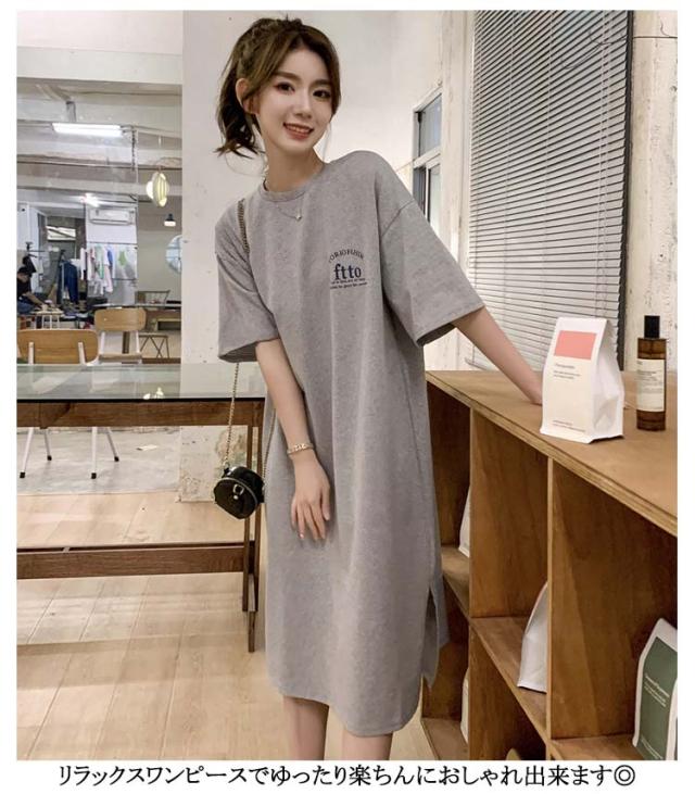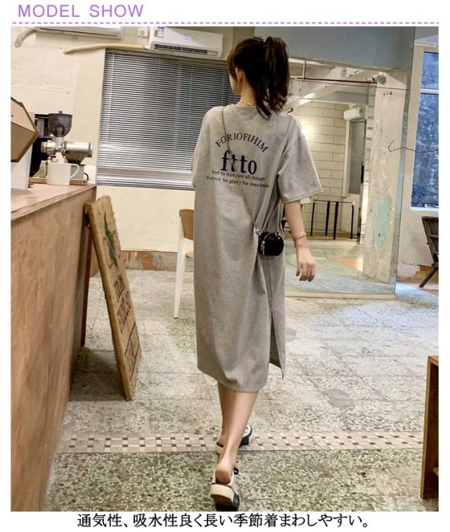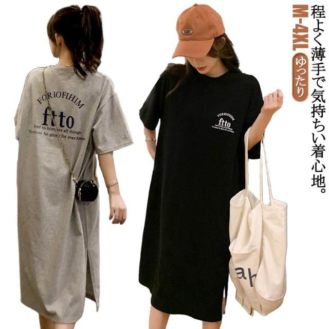 半袖 夏 半袖 春 大きいサイズ サイドスリット かわいい Tシャツワンピ ゆるワンピ レディース Tシャツ 部屋着 ロング丈 ルームウェア ロングワンピ 体型カバー ゆったり 大きめ プリント 英字ロゴ 楽ちん ワンピース