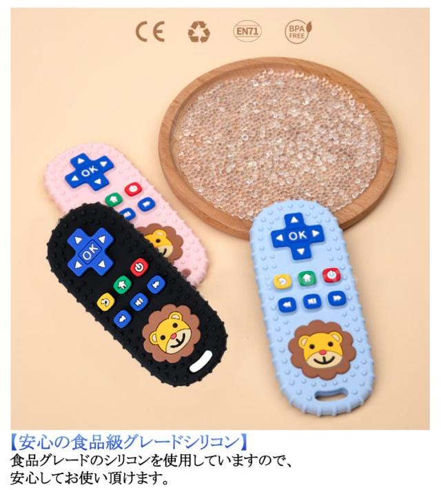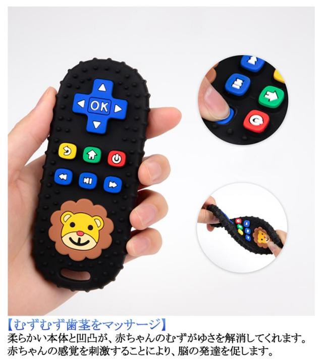 | 歯がためリモコン 3ヶ月頃〜 【リモコン型の歯固め】 赤ちゃんの小さな手でも持ちやすい、リモコン型のベビー用歯がためです。 【むずむず歯茎をマッサージ】 柔らかい本体と凹凸が、赤ちゃんのむずがゆさを解消してくれます。赤ちゃんの感覚を刺激することにより、脳の発達を促します。 【安心の食品級グレードシリコン】食品グレードのシリコンを使用していますので、安心してお使い頂けます。 【簡単なお手入れ】 水洗い、煮沸、電子レンジ、食洗器。-20℃〜220℃の耐熱性を持ったシリコンはがためは、一般的に行われる全ての殺菌・消毒方法に対応しています。 | |