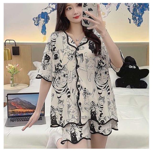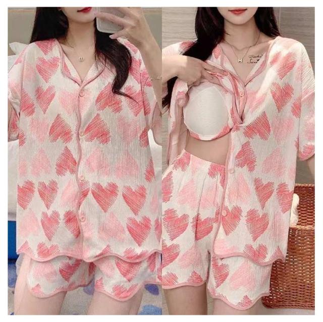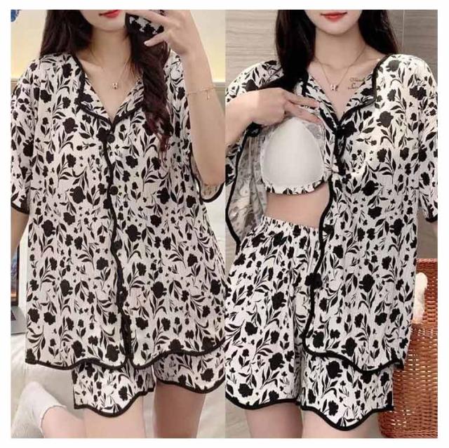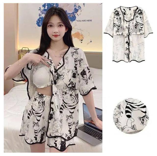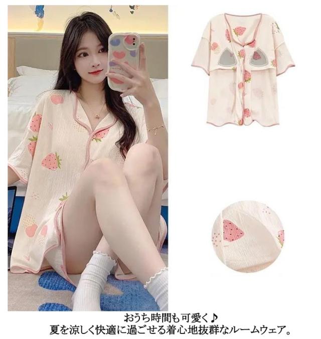 | カップ付き上下セット!前開き前ボタンタイプで着やすいので、授乳や入院などにもおすすめ。 ウエストはゴム仕様なので、たくさん動いてもストレスなく快適に着用いただけます。 おうち時間も可愛く♪夏を涼しく快適に過ごせる着心地抜群なルームウェア。 | |
