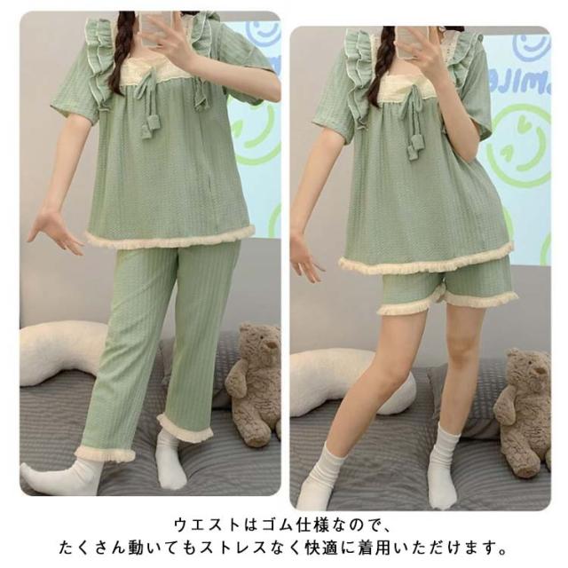 レディース 半袖 可愛い ルームウェア ウエストゴム 上下セット 大きいサイズ ルームウェア パジャマ 3点セット かわいい ナイトウェア 夏 ハーフパンツ 短パン ショートパンツ ロングパンツ フリル M L XL 2XL 3XL 4XL