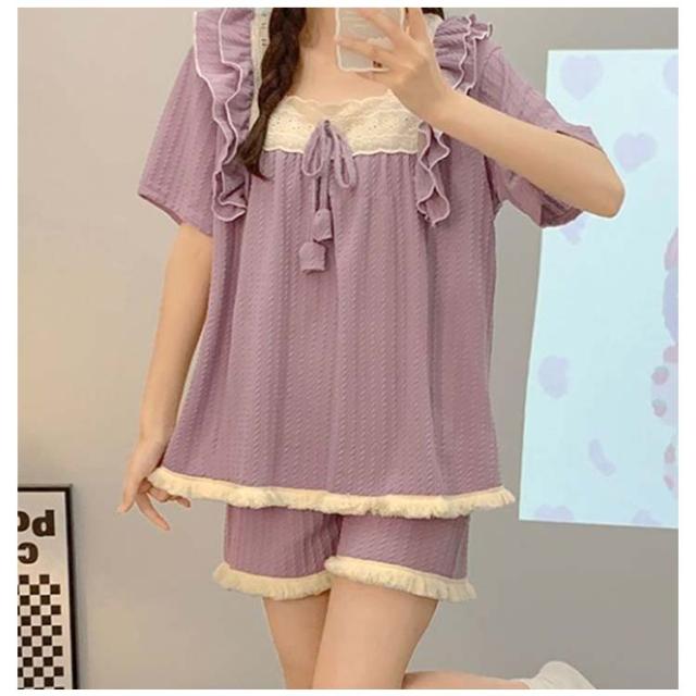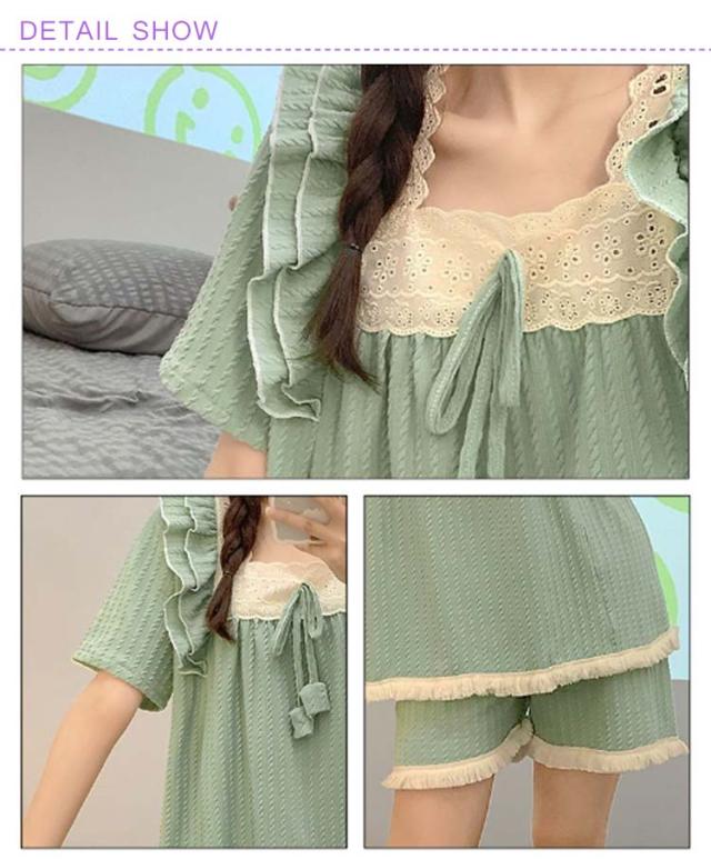 | 【半袖トップス+ロングパンツ+ショートパンツのパジャマ3点セット】 大人可愛いデザインのパジャマ3点セットです。 ウエストはゴム仕様なので、たくさん動いてもストレスなく快適に着用いただけます。 おうち時間も可愛く♪夏を涼しく快適に過ごせる着心地抜群なルームウェア。 | |