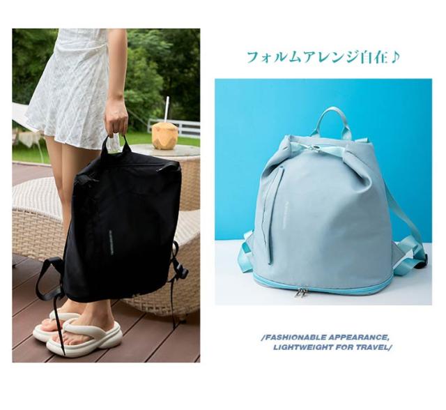 | フォルムアレンジ自在♪ デザイン性と機能性が兼ね備えた2wayジムバッグ。 濡れたものと乾いたものを分けられる防水ポケット付きで、濡れたタオルなど困らず収納できます。 底面にはシューズ専用収納スペースを装備しているので、靴と他の荷物を分けて収納できて衛生的です。 撥水加工で水や汚れにも強く、雨の日も安心。水を弾くので汚れもサッと拭けてお手入れ簡単です。 リュックとして背負っても、手持ちバッグとしても使える2WAY仕様だから、コーデに合わせてスタイルチェンジできます。 シンプルでスタイリッシュなデザインで、通学バッグや普段のお出かけ、マザーズバッグとしてもおすすめです。ジムデビューや夏のレジャーにも、ぜひ取り入れてみてください! 無地おしゃれなデザイン、中学生や高校生、大人に年齢を問わず、だれでもおしゃれに使いまわせます。 | |