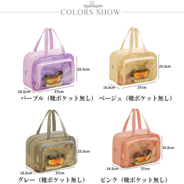 | 色 | パープル(靴ポケット無し) ベージュ(靴ポケット無し) グレー(靴ポケット無し) ピンク(靴ポケット無し) グリーン(靴ポケット無し) ブラック(靴ポケット無し) パープル(靴ポケット有り) ベージュ(靴ポケット有り) グレー(靴ポケット有り) ピンク(靴ポケット有り) グリーン(靴ポケット有り) ブラック(靴ポケット有り) |