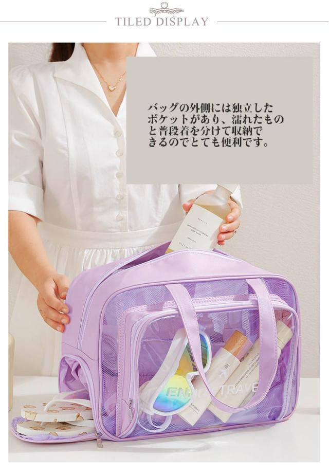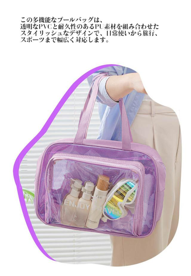 | 仕分け収納可能のプールバック。 バッグの外側には独立したポケットがあり、濡れたものと普段着を分けて収納できるのでとても便利です。 この多機能なプールバッグは、透明なPVCと耐久性のあるPU素材を組み合わせたスタイリッシュなデザインで、日常使いから旅行、スポーツまで幅広く対応します。 防水素材を採用しており、プールや海に行く際もバッグの中身が濡れる心配がありません。雨の日でも安心して使えます。 中身が一目で確認できる透明デザインで、必要な物をすぐに取り出せます。 学校の水泳授業はもちろん、部活や海やプール、ジム、サウナ、お釣り、温泉、スポーツなど、さまざまなシーンで使えます。 おしゃれなシンプルなデザイン、年齢や性別を問わず、様々なシーンで大活躍するプールバッグです。 | |