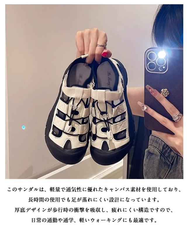| このサンダルは、軽量で通気性に優れたキャンバス素材を使用しており、長時間の使用でも足が蒸れにくい設計になっています。厚底デザインが歩行時の衝撃を吸収し、疲れにくい構造ですので、日常の通勤や通学、軽いウォーキングにも最適です。 レースアップスタイルは、足にぴったりとフィットするよう調整可能で、安定した歩行をサポートします。足の甲部分にはマジックテープが付いているので調節できます。また、シンプルながらもおしゃれなデザインは、どんな服装にも合わせやすく、カジュアルな日常着からアクティブなシーンまで幅広く活躍します。色展開も豊富で、黒と白の基本色はどんなスタイルにもマッチし、コーディネートの幅を広げてくれます。 このサンダルは、忙しい毎日を過ごす現代女性にとって、快適さとファッションを両立させるための理想的な選択肢です。夏の暑い日でも快適に過ごせるように、一足は持っておきたいアイテムです。 | |