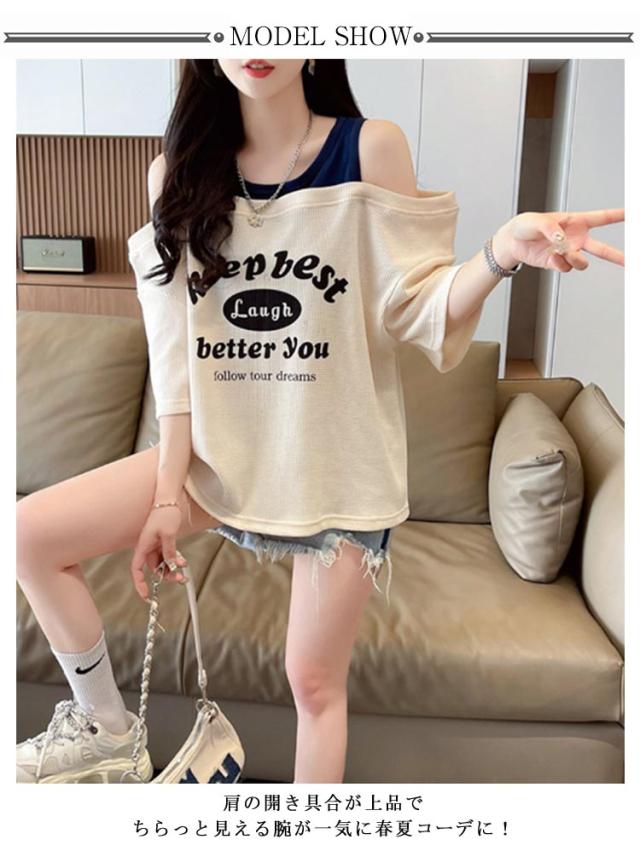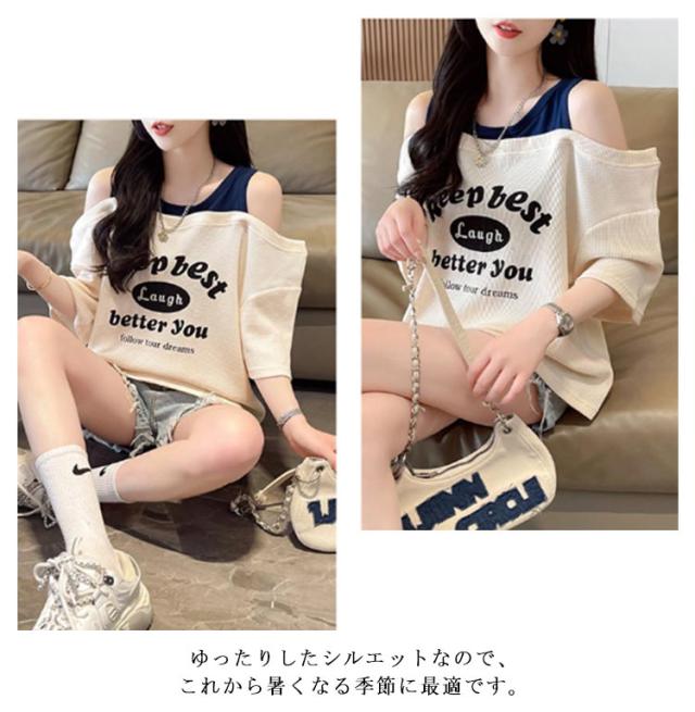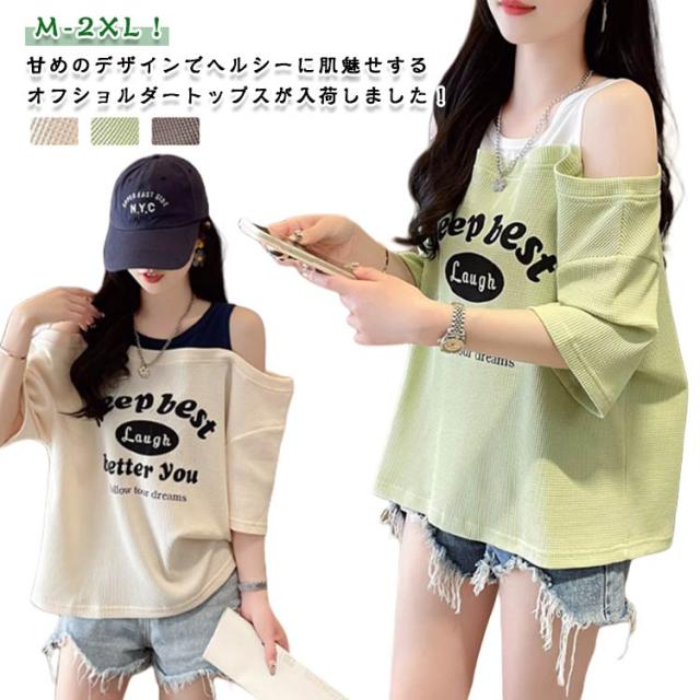 デザイントップス オフショル トップス Tシャツ オフショル カットソー プルオーバー Tシャツ レディース オフショルダー トップス 肩だし 肌見せ 半袖 ロンT トップス 韓国ファッション
