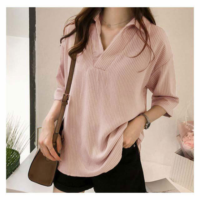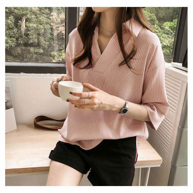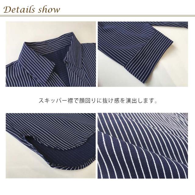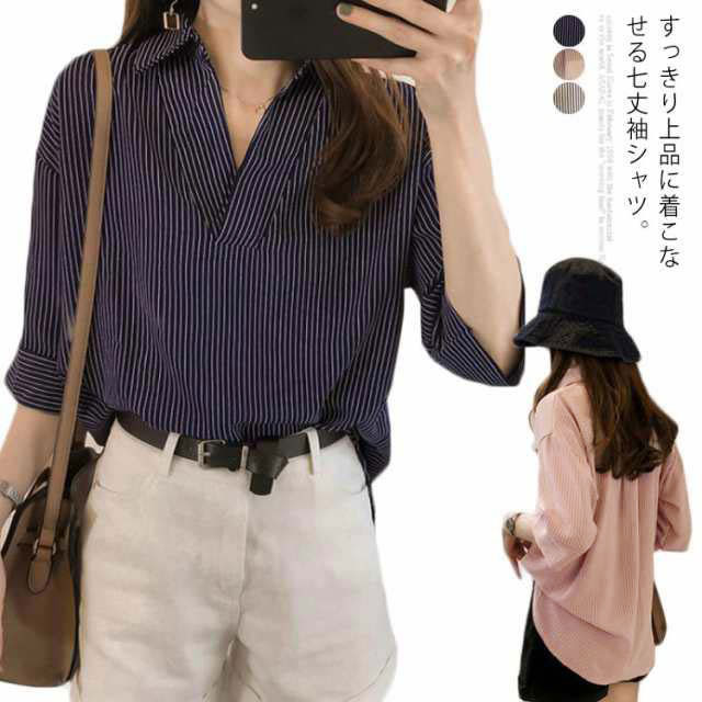 シャツ レディース 七分袖シャツ スキッパーシャツ Vネック スキッパー襟 ストライプ トップス 前後差 薄手 シャツ ゆったり 大人 可愛い 大きいサイズ おしゃれ きれいめ ナチュラル カジュアル オフィス フォーマル OL 春 夏 送料無料