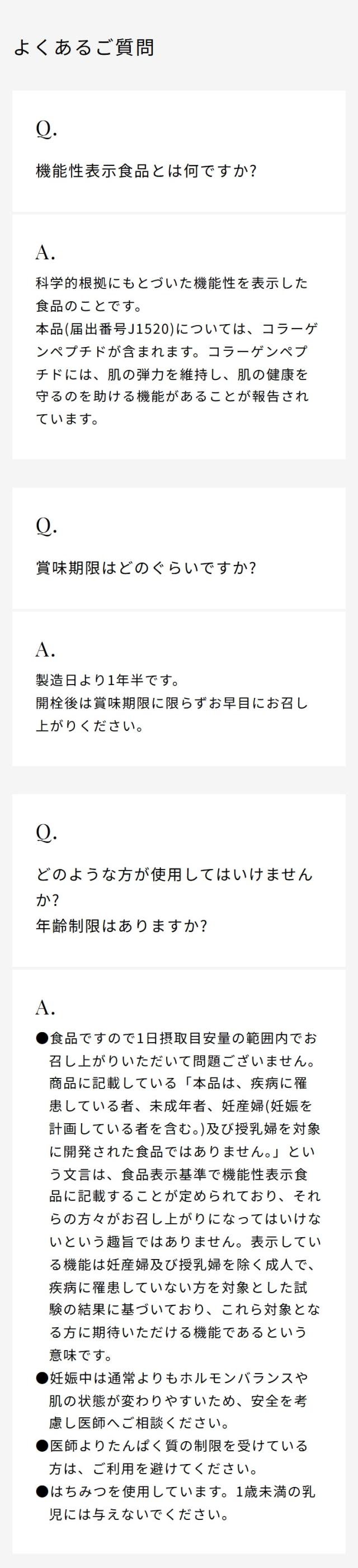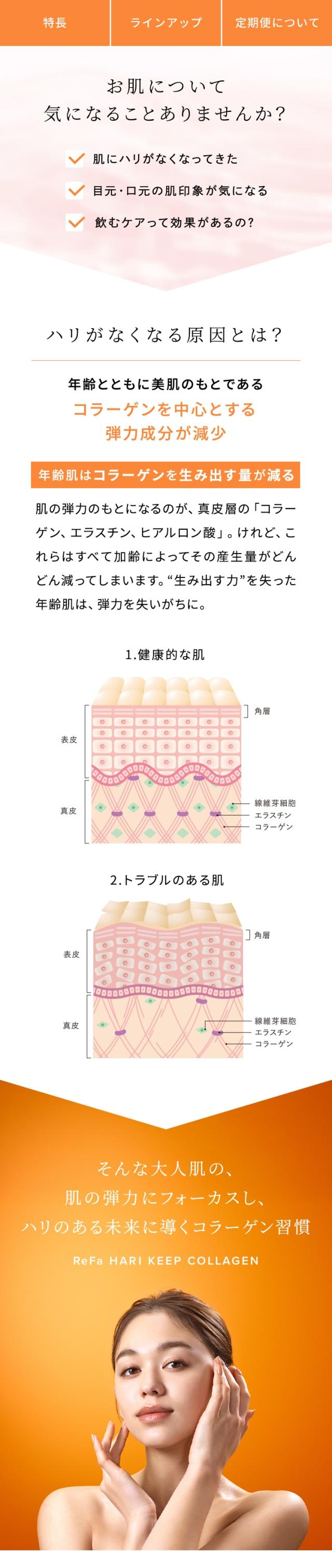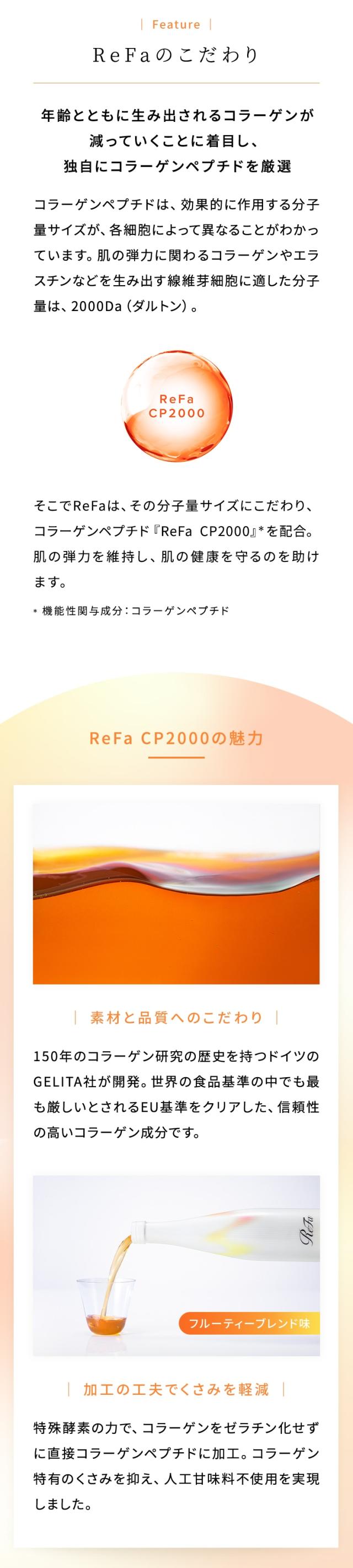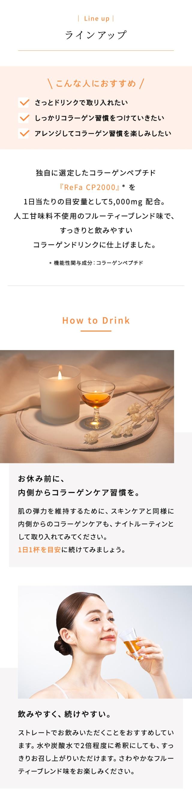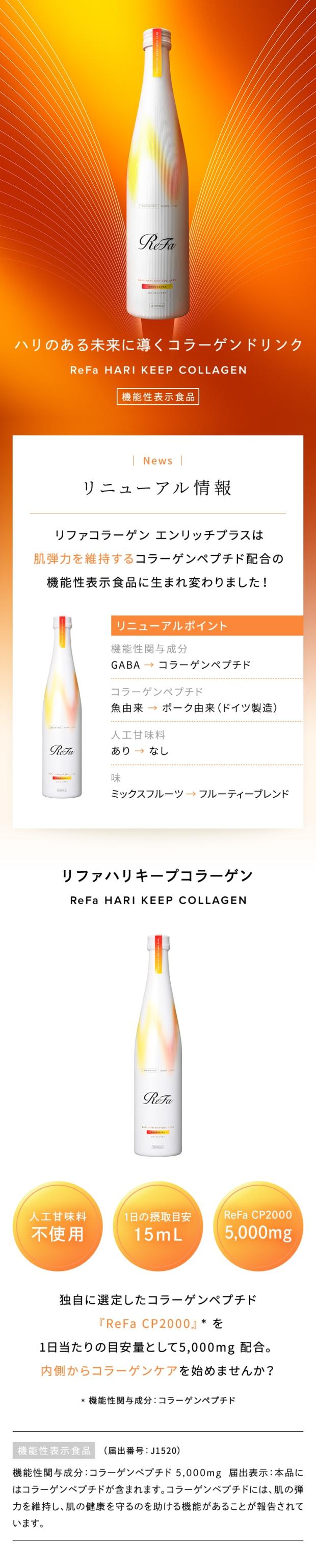 商品名 ReFa HARI KEEP COLLAGEN リファハリキープコラーゲン 品番 RT-AT-00A 原材料名 コラーゲンペプチド(ドイツ製造)、精製はちみつ、ラカンカエキス末/酸味料、香料、保存料(安息香酸Na)、甘味料(ステビア) 重量 960 g 付属品 ヒンジキャップ サイズ 約H295×W62φ×D62φ 内容量 480ml 1日の摂取目安量 15ml 保存方法 必ず冷蔵保存してください。 機能性関与成分 コラーゲンペプチド 5,000mg