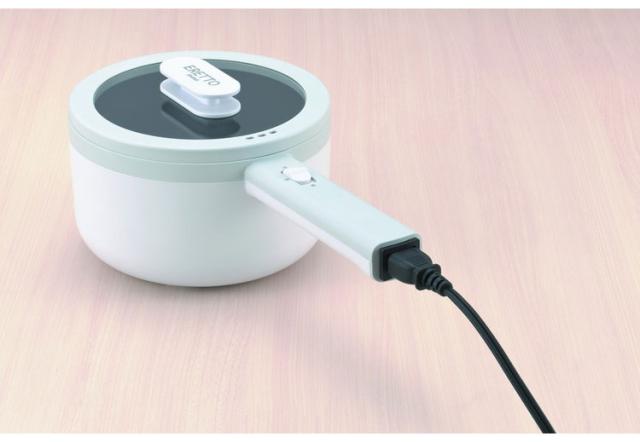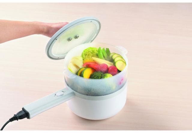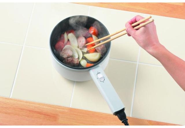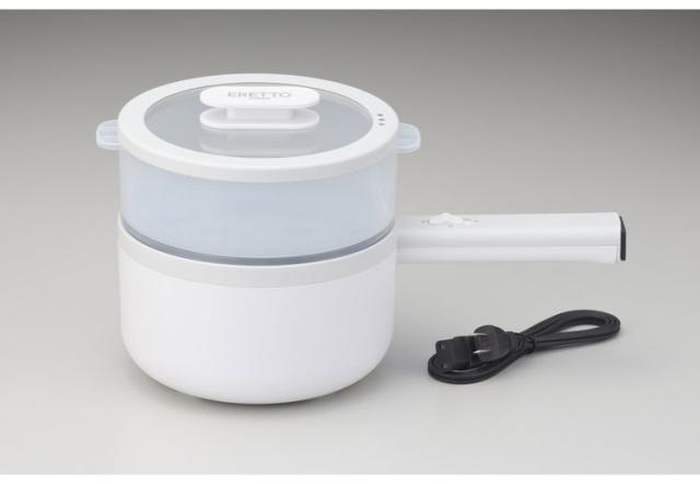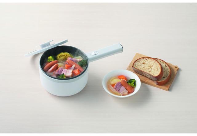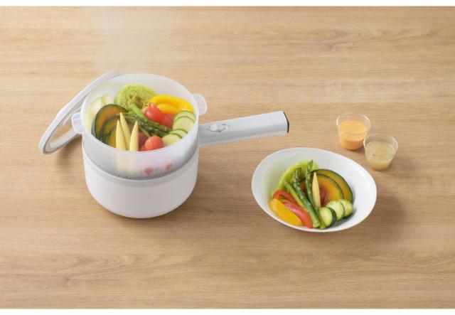 火を使わずに調理ができる片手鍋。せいろ付きで蒸し料理にも対応。コンセントがあれば、コンロやIHがなくても、ダイニングで、オフィスで煮る・茹でるの調理ができます。鍋はふっ素加工なので簡単お手入れです。