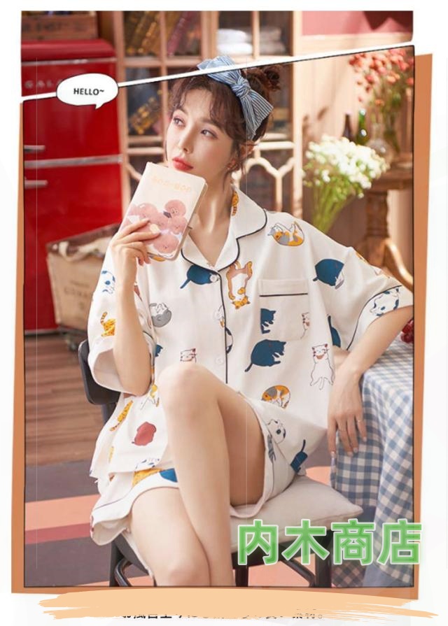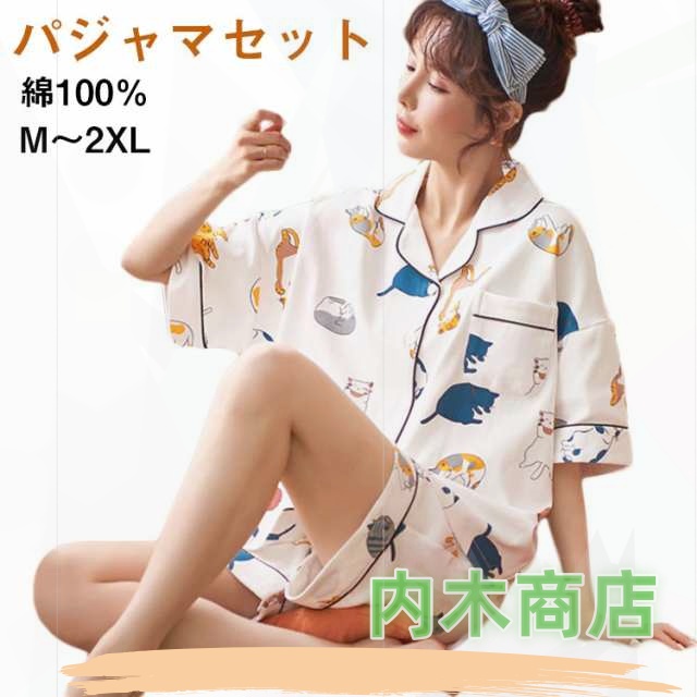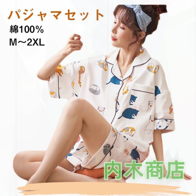 前開き 寝間着 2点セット 綿 セットアップ ショートパンツ パジャマ ギフト ナイトウェア ルームウェア 綿100% 猫柄 夏 春 プレゼント 可愛い柄 部屋着 半袖 上下セット ネコ 薄手 レディース 送料無料 襟あり