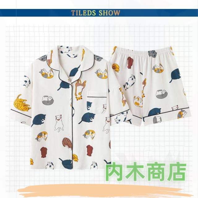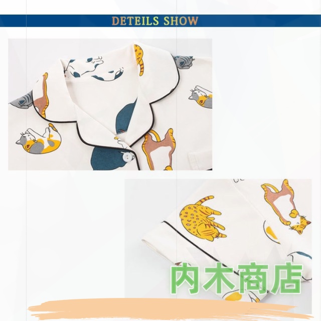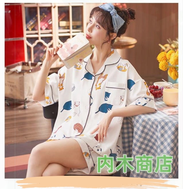 売上急増中 猫柄 レディース 収納便利 プレゼント 薄手 ネコ ルームウェア 上下セット 襟あり 夏 セットアップ 半袖 部屋着 パジャマ 春 ショートパンツ ギフト ナイトウェア 綿 寝間着 前開き 2点セット 可愛い柄 綿100% 今だけ限定 送料無料