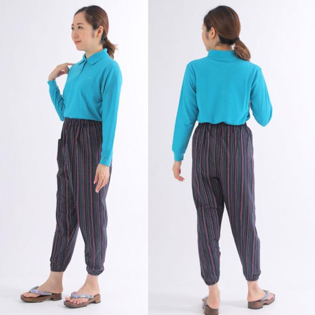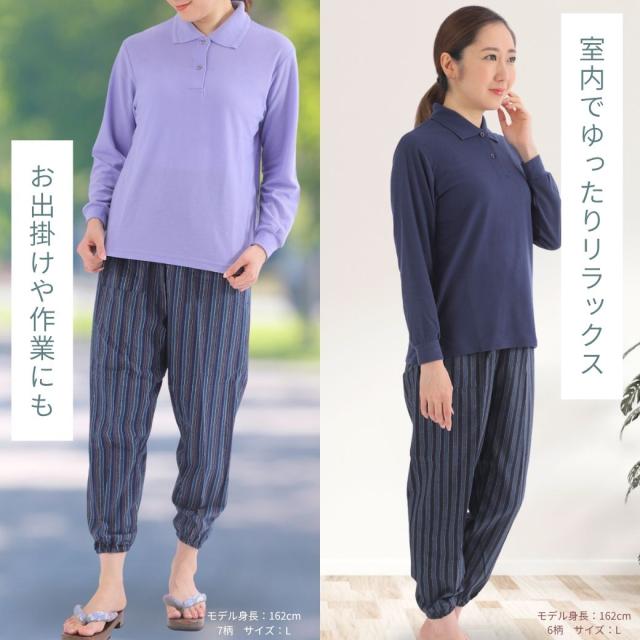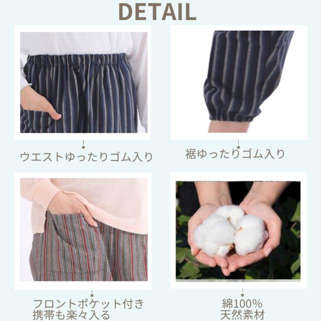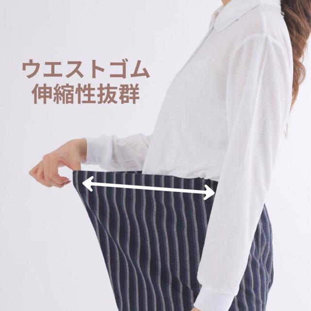 ■サイズ サイズ Mサイズウエスト64.0-70.0ヒップ87.0-95.0股下59.0Lサイズウエスト69.0-77.0ヒップ92.0-100股下60.0LLサイズウエスト77.0−85.0ヒップ97.0-105股下62.03Lサイズウエスト85.0-93.0ヒップ102-110股下65.0■カラー ベージュ系・レッド系・ホワイトイエロー系・ブルー系・ネイビー系■素材(生地・毛糸) 綿・コットン■柄 ストライプ・縞模様・しじら織■生産国 日本■テイスト(ファッション) カジュアルオフィス・ビジネスキレカジシンプルフォーマル和風■洗濯表示 家庭洗濯■シーズン 夏■パンツ脚幅 ワイド■商品説明 蒸し暑く、湿度の高い日本の夏——そんな季節を少しでも快適に、心地よく過ごすために生まれた一着が、「しじら織カツオ縞もんぺ」です。伝統と現代の快適さを融合したこのもんぺは、一度履けば、毎日の暮らしに欠かせない存在となることでしょう。使用している「しじら織」は、江戸時代から続く日本の伝統的な織物。特徴は、生地表面に自然に現れる細かい“しぼ(凹凸)”です。このしぼが空気の通り道となり、汗をかいても生地が肌に密着せず、常にさらっとした清涼感をもたらします。通気性・吸水性・速乾性に優れており、特に湿気の多い日本の夏にはぴったりの素材。洗濯しても乾きが早く、お手入れも簡単です。柄には、江戸の粋を感じさせる「カツオ縞(かつおじま)」を採用。カツオの背中のような勢いある縦縞が、スッとした印象を与え、視覚的にも涼やか。落ち着いた色合いでありながらも、どこか遊び心を感じさせるデザインは、年齢や性別を問わず、幅広い方に愛されています。古き良き日本の意匠と現代のファッション性が調和した一着です。ウエストはゴム仕様で、自分好みにサイズ調整が可能。締めつけ感が少なく、ストレスフリーな着心地。シルエットは全体的にゆったりしており、足元に向かって自然にすぼまるテーパードデザインが美しいラインを作ります。ポケットも便利な位置についており、機能性も十分。室内着としてリラックスして過ごすのはもちろん、近所へのお買い物や散歩、旅行中の移動着、ちょっとした作業着としても大活躍。さらには、旅館や和カフェでのユニフォームとしても人気があるのもうなずけます。伝統に寄り添いながらも、暮らしのさまざまなシーンに馴染む万能アイテムです。サイズはM・L・LL・3Lの4展開、カラーは選べる7色。体型や好みに応じて、あなたにぴったりの一枚が見つかります。どの色も落ち着いたトーンでコーディネートしやすく、色違いで揃えるのもおすすめです。「ただの部屋着」ではない、「気の利いた日常着」。このもんぺには、日本の知恵と工夫、そして着る人へのやさしさが詰まっています。伝統的でありながら、今の暮らしに寄り添う。そんな“新しい日常”を、この一本からはじめてみませんか?■注意 モニター発色の具合により色合いが異なる場合がございます。