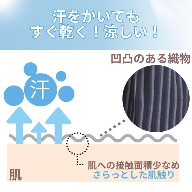 【カラー】 ベージュ系・レッド系・ホワイトイエロー系・ブルー系・ネイビー系【素材】 綿・コットン【柄】 ストライプ・縞模様・しじら織【生産国】 日本【テイスト】 和風【洗濯表示】 家庭洗濯【パンツ脚幅】 ワイド【商品説明】 蒸し暑く、湿度の高い日本の夏——そんな季節を少しでも快適に、心地よく過ごすために生まれた一着が、「しじら織カツオ縞もんぺ」です。伝統と現代の快適さを融合したこのもんぺは、一度履けば、毎日の暮らしに欠かせない存在となることでしょう。使用している「しじら織」は、江戸時代から続く日本の伝統的な織物。特徴は、生地表面に自然に現れる細かい“しぼ(凹凸)”です。このしぼが空気の通り道となり、汗をかいても生地が肌に密着せず、常にさらっとした清涼感をもたらします。通気性・吸水性・速乾性に優れており、特に湿気の多い日本の夏にはぴったりの素材。洗濯しても乾きが早く、お手入れも簡単です。