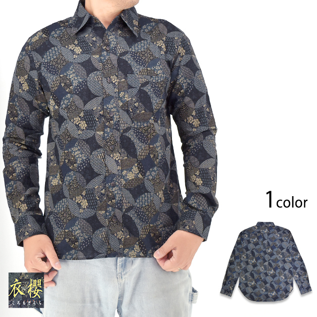 古布調長袖レギュラーカラーシャツ「変わり七宝」 衣櫻 SA-1718 和柄 和風 日本製 国産 総柄