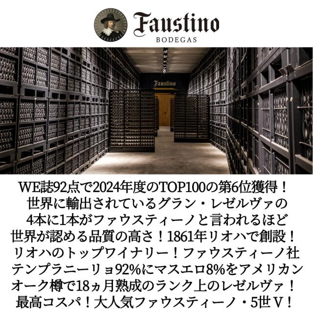 WE誌92点で2024年度のTOP100の第6位獲得! 世界に輸出されているグラン・レゼルヴァの 4本に1本がファウスティーノと言われるほど世界が認める品質の高さ!1861年リオハで創設! リオハのトップワイナリー!ファウスティーノ社 テンプラニーリョ92%にマスエロ8%をアメリカンオーク樽で18ヵ月熟成のランク上のレゼルヴァ! 最高コスパ!大人気ファウスティーノ・5世 V!