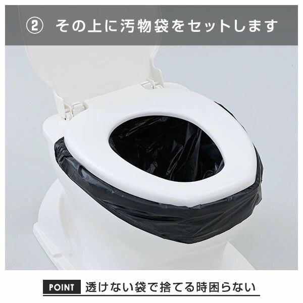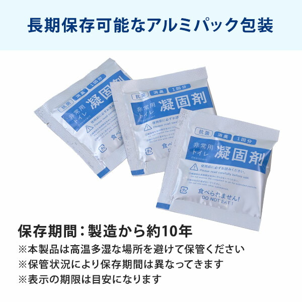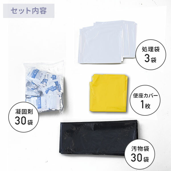 | 商品説明 | ●セット内容: 凝固剤×30個、汚物袋(黒)×30枚、便座カバー(黄色)×1枚、処理袋(白)×3枚 ●災害、停電、断水、介護、渋滞に。大容量タイプ ●凝固剤はたっぷり10g入り。長期保存可能なアルミパック包装 ●水がなくても気軽にトイレができる ●消臭、抗菌 ※消臭効果はアンモニア臭に対する効果です ●使用方法:便座を上げた状態で便器に便座カバーをかぶせます。便座カバーの上に汚物袋をかぶせます。使用後、凝固剤を振りかけます。汚物袋だけを取り出し、口を結びます。汚物袋を処理袋に入れて各自治体の指示に従って廃棄してください ●トイレがない場合でもバケツ等を利用して簡易トイレとして対応可能 ●保存期間:製造から約10年 ※本製品は高温多湿な場所を避けて保管ください ※保管状況により保存期間は異なってきます ※表示の期限は目安になります |