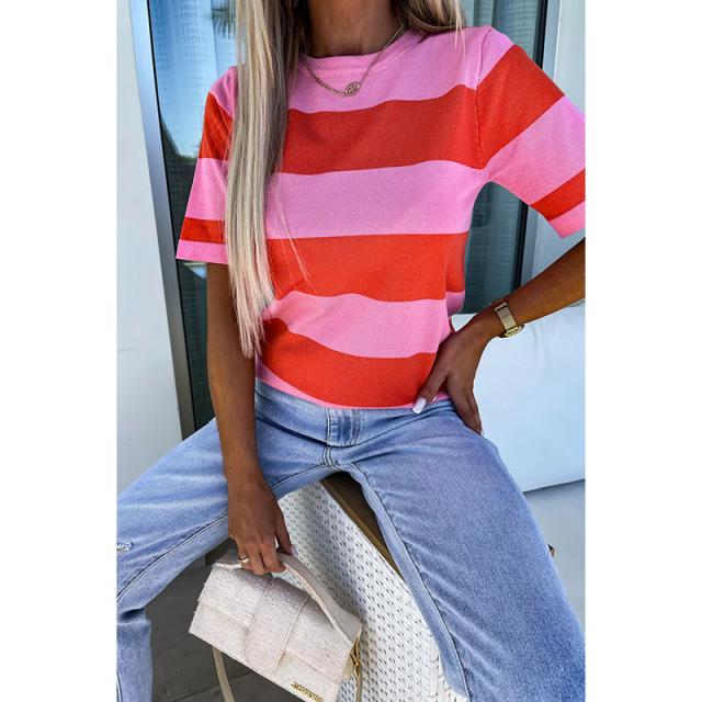 春夏新作プルオーバー丸襟五分袖上着女性ドーパミン色合わせニットtシャツ
