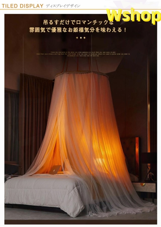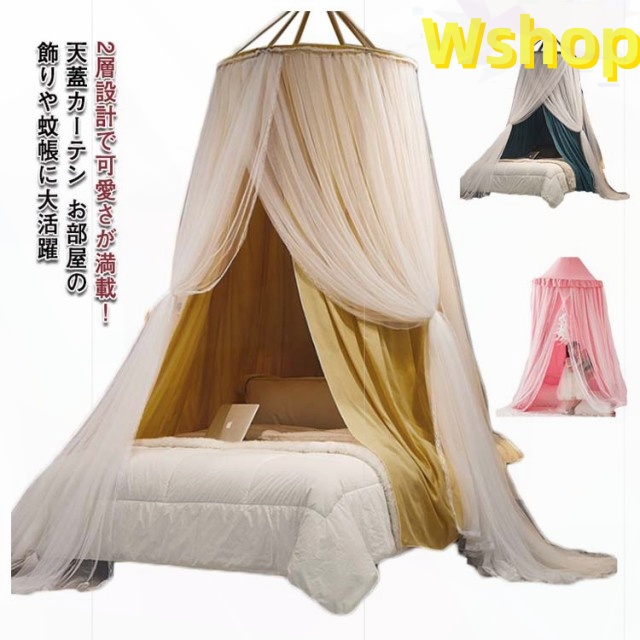 | 2層設計で可愛さが満載!天蓋カーテン お部屋の飾りや蚊帳に大活躍 大人向けと子供向けの2タイプ用意! 【おしゃれ】吊るすだけでロマンチックな雰囲気で優雅なお姫様気分を味わえる! 【多用途】布生地とメッシュの2層設計で可愛さが満載!お部屋に飾るだけで雰囲気をぐっと変わってきます。布生地で遮光性は抜群!高さは2.7Mで床まで伸ばせるので、蚊などの害虫からしっかり守りますし、夏場の強い日差しやエアコンをの冷風をガード!お昼寝でも夜でも快適に睡眠、リラックスできます。 【大きなスペース】直径100cmと高さ270cmの大きいサイズなので、シングルベッドやダブルベッドにも適応できます!子供用テントや遊び場としても大活躍。 【取り付け簡単】組立不要で付属した部品を使い、天井に吊るすだけ! 【プレゼントとして】友達や彼女、お子様への誕生日プレゼント、子供の日、クリスマスプレゼントなどにぴったりです。 | |