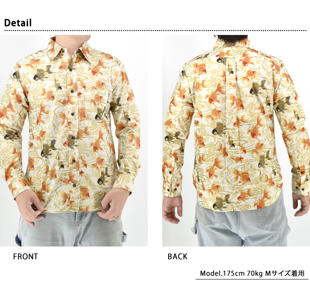 長袖レギュラーカラーシャツ「金彩流水金魚」 衣櫻 SA-1725 和柄 和風 日本製 国産 総柄 きんとと