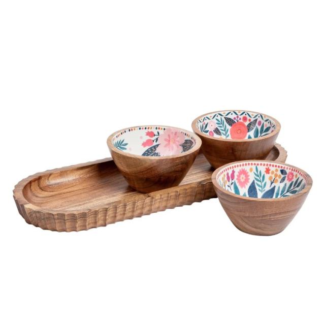 Phoenix は、バラ、ツバキ、デイジー、ペチュニアなどのさまざまな花を黄色、青、珊瑚の色合いと混ぜ合わせたブーケからインスピレーションを得て、明るいテーブル シーンを演出しています。この 4 ピースのアカシア材サービング セットは、サイド ディッシュ、ナッツ、ディップなどに最適です