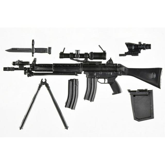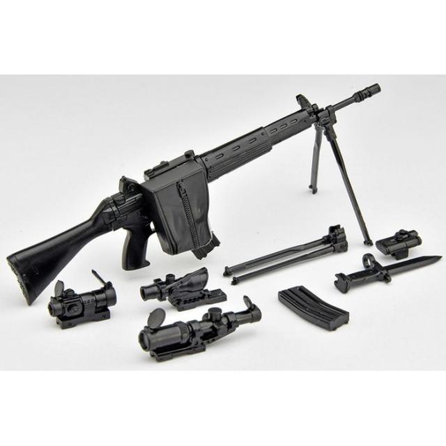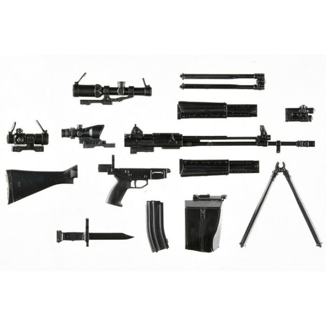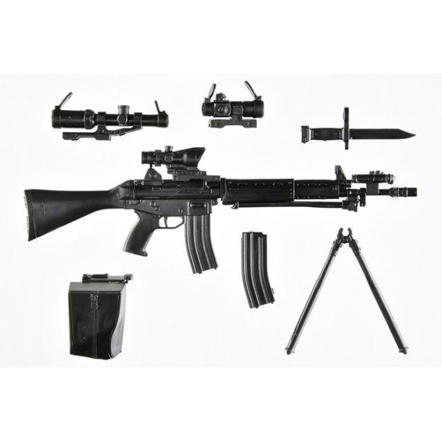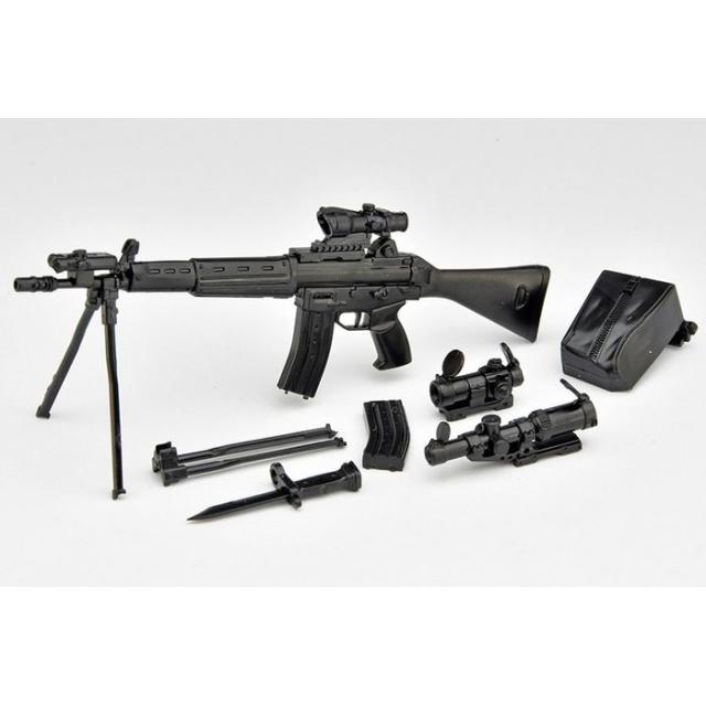1989年に自衛隊に採用された5.56mm口径の国産アサルトライフル、89式小銃。当時の主力小銃としてはコンパクトで、日本人の体格に合わせたデザインが特徴。消炎制退器の銃口制退機能によって高い制動性と良好な集弾性能を有する。2脚は着脱式、NATO標準のSTANAGマガジンも共有可能。今回の1.5版は、前作[LA020]89式小銃に、薬莢受け、ドットサイトやスコープ、レーザーエイミングモジュールなどのエクストラパーツを追加。お好みのセットアップが選択できる仕様となりました。figma自衛隊員や各種可動フィギュアと組み合わせてお楽しみください。