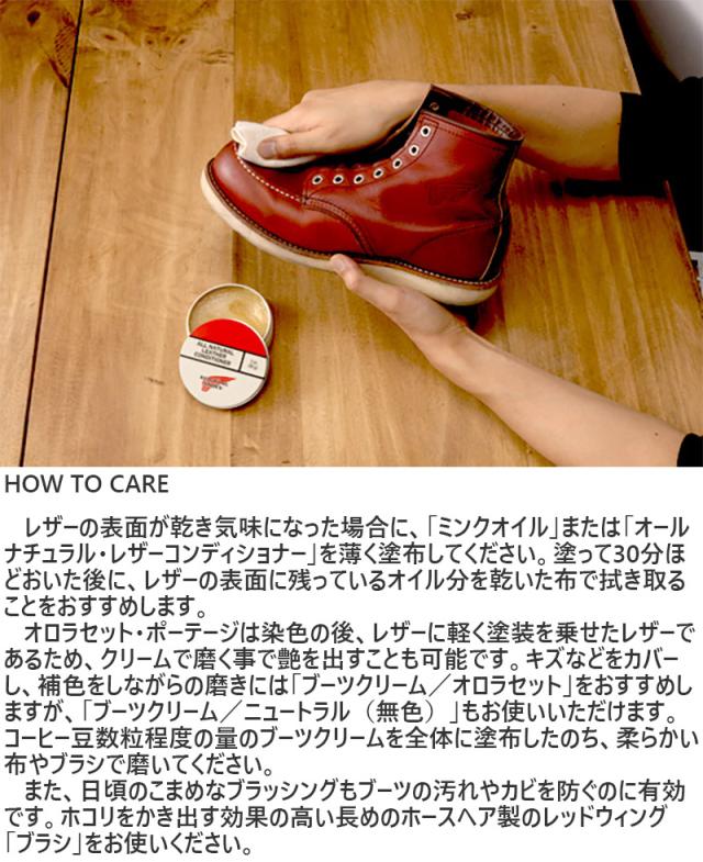 レザーの表面が乾き気味になった場合に、「ミンクオイル」または「オールナチュラル・レザーコンディショナー」を薄く塗布してください。塗って30分ほどおいた後に、レザーの表面に残っているオイル分を乾いた布で拭き取ることをおすすめします。オロラセット・ポーテージは染色の後、レザーに軽く塗装を乗せたレザーであるため、クリームで磨く事で艶を出すことも可能です。キズなどをカバーし、補色をしながらの磨きには「ブーツクリーム/オロラセット」をおすすめしますが、「ブーツクリーム/ニュートラル(無色)」もお使いいただけます。コーヒー豆数粒程度の量のブーツクリームを全体に塗布したのち、柔らかい布やブラシで磨いてください。