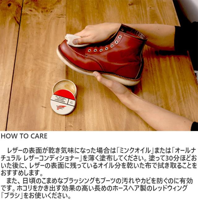 また、日頃のこまめなブラッシングもブーツの汚れやカビを防ぐのに有効です。ホコリをかき出す効果の高い長めのホースヘア製のレッドウィング「ブラシ」をお使いください。
