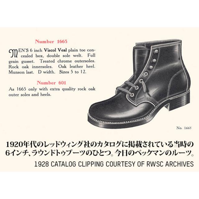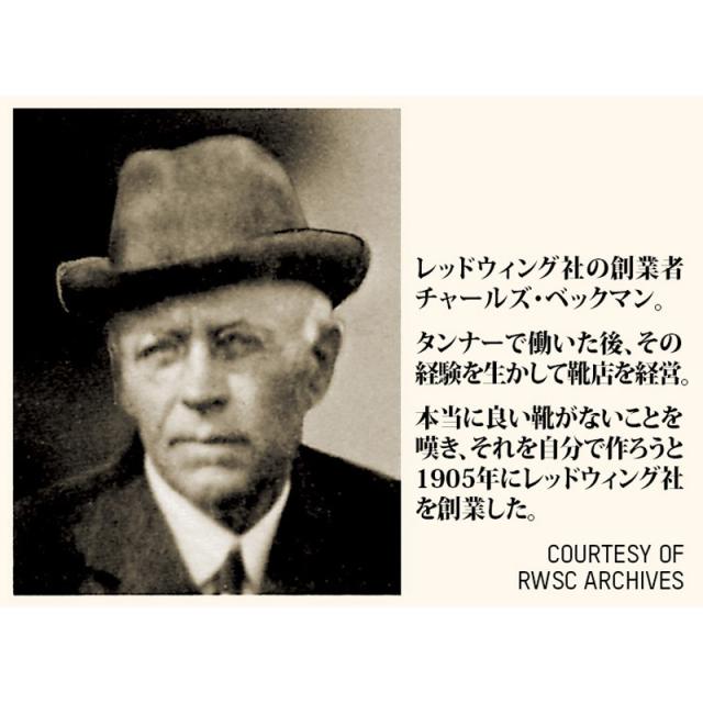 1905 年にレッドウィング社を創業したチャールズ・ベックマンにちなんで名付けられた「ベックマンブーツ」は、社の創業期である20 世紀初頭のレッドウィング社のブーツをベースに、今?の素材とテイストをミックスして2006年に誕?しました。