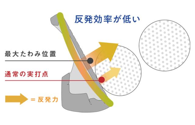 フェースセンターを最大たわみ位置としてたわみ、実打点の反発力は低下する。